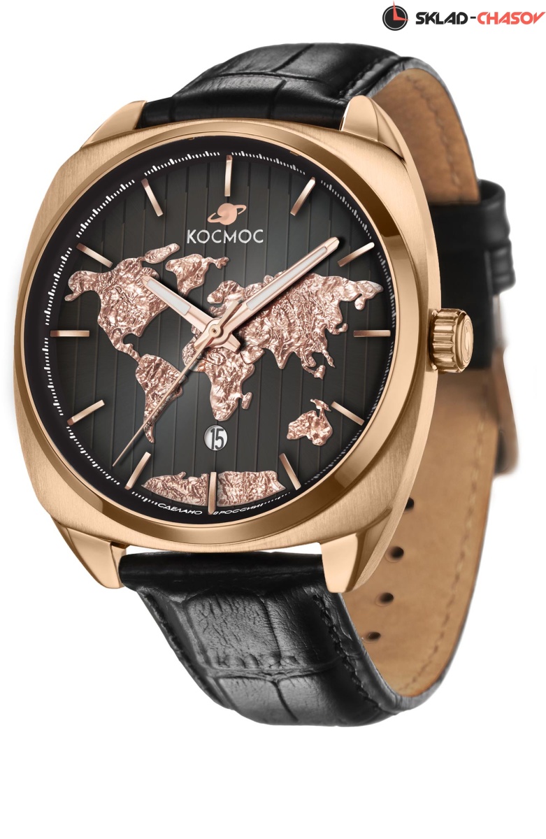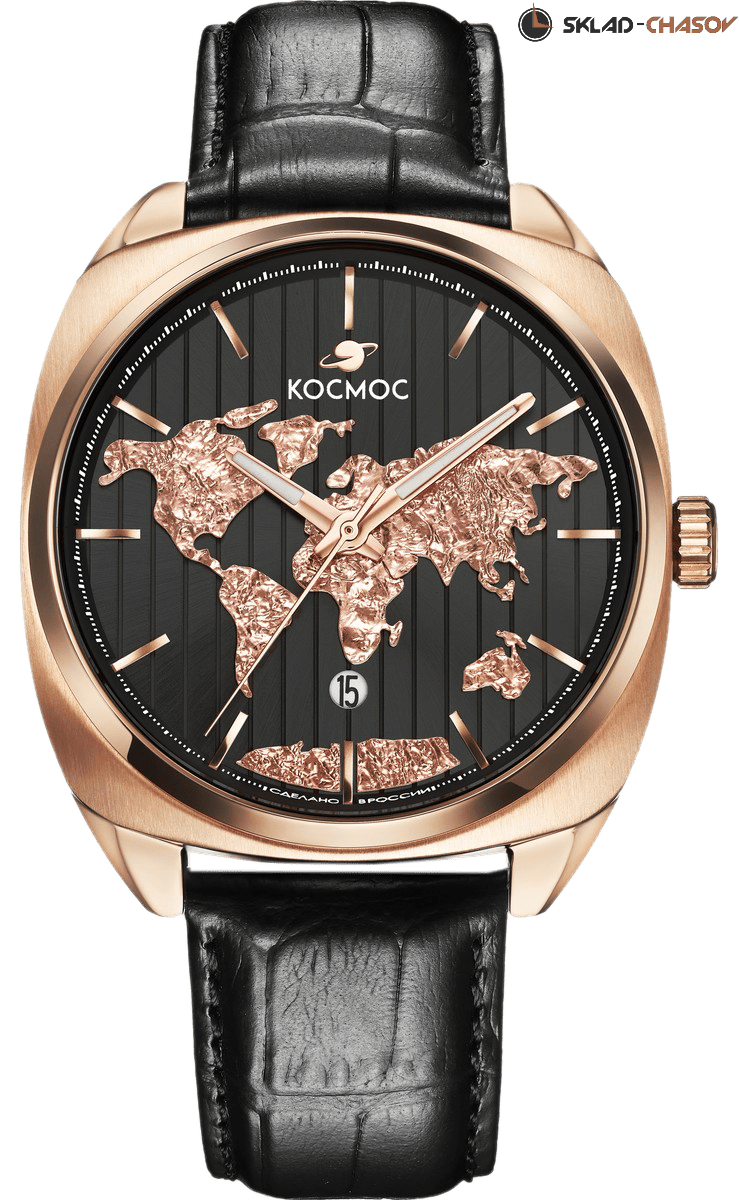 Часы установлены на ремешок из натуральной кожи черного цвета, застежка-пряжка сделана из нержавеющей стали и украшена логотипом бренда Космос.