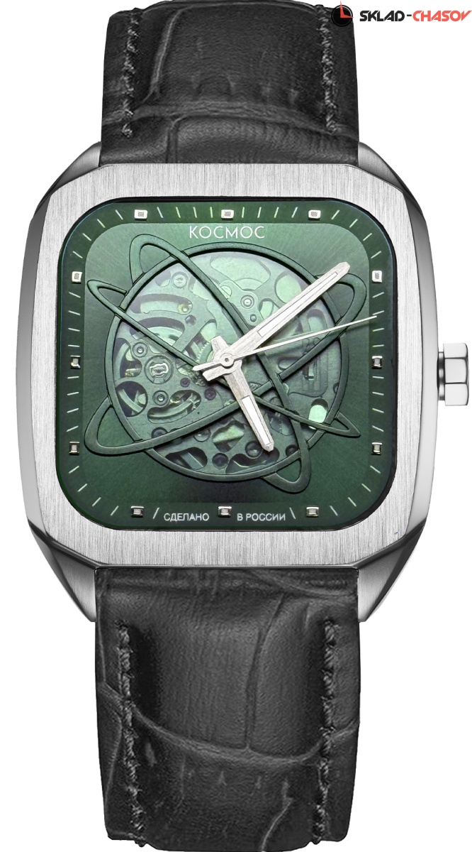 Корпус часов установлен на ремешок зеленого цвета, сделанный из натуральной кожи. Застежка-клипса из нержавеющей стали оснащена двумя боковыми кнопками для удобного использования и снижения риска случайного расстегивания.