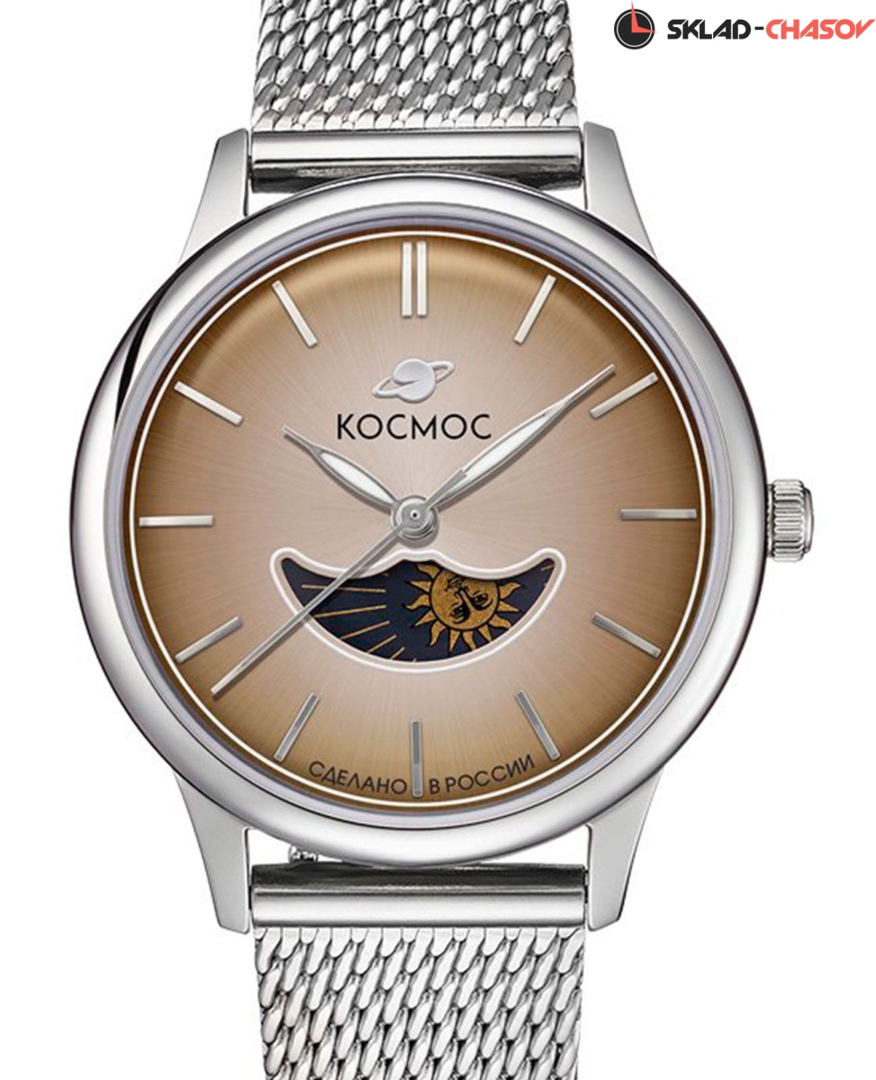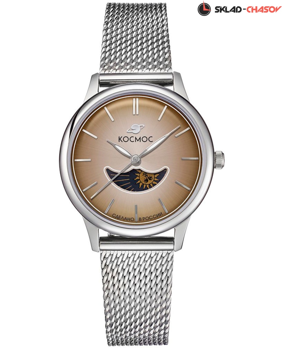 Женские наручные часы Космос Солнце и Луна K 617.12.32 M — это сочетание традиций часового искусства 60-70-х годов и футуристического дизайна, вдохновленного космическими исследованиями. Они не только служат напоминанием о прошлом, но и побуждают задуматься о будущем, позволяя наслаждаться качеством и смыслом, вложенными в каждую деталь. Полированный корпус часов выполнен в виде силуэта летающей тарелки благодаря выпуклым формам стекла и нижней части корпуса. Стальные ушки, которые напоминают опоры летающей тарелки, завершает общий образ. На задней крышке часов выгравирован фантазийный сюжет – космическая станция будущего. Элегантные женские часы из серии Солнце и Луна выделяются функцией день/ночь. Бежевый циферблат выполнен в ретро-стиле с выгнутыми краями, что требует применения сложных технологий в производстве. Циферблаты такой формы были характерны для часов прошлых эпох. Кончик секундной стрелки изогнут в соответствии с формой циферблата. На градиентном выпуклом циферблате выполнена шлифовка в стиле солнечных лучей, а также размещены индексы, изготовленные вручную и закрепленные на двух штифтах. Часовая и минутная стрелки, а также круг по краю циферблата, напоминающий ореол Земли, с люминесцентным покрытиемЛюминесцентное покрытиеПозволяет считывать показания времени в темноте. Производители наносят на стрелки, часовые индексы, безель или поверхность циферблата светонакопительный состав, дающий холодное свечение., которое светится в темноте, создавая завораживающий эффект. Форма минерального стеклаМинеральное стеклоМинеральное стекло представляет собой искусственно выращенный минерал кварца. Такое стекло отличается особой устойчивостью к повреждениям и царапинам. Уступает по некоторым качествам сапфировому стеклу. тщательно продумана: оно выгнуто как снаружи, так и изнутри. Такое решение позволяет избежать искажения изображения на циферблате, в отличие от стекла с прямой внутренней частью, которое создает эффект линзы. Стальной браслет с миланским плетением выполнен из прочной стали и дополнен раскладной застёжкойРаскладная застёжкаТакой тип застёжки используется только на браслетах из металла. Она никогда не раскрывается полностью, происходит разделение на 2 и более частей. Раскладывающая застёжка снизит вероятность потери часов к минимуму., обеспечивающей комфорт и надёжную фиксацию на запястье. Его конструкция подчёркивает элегантность и стиль, а устойчивость к царапинам делает аксессуар долговечным и практичным в повседневной носке. Заводная головка, застежка и ремешок украшены фирменным логотипом.