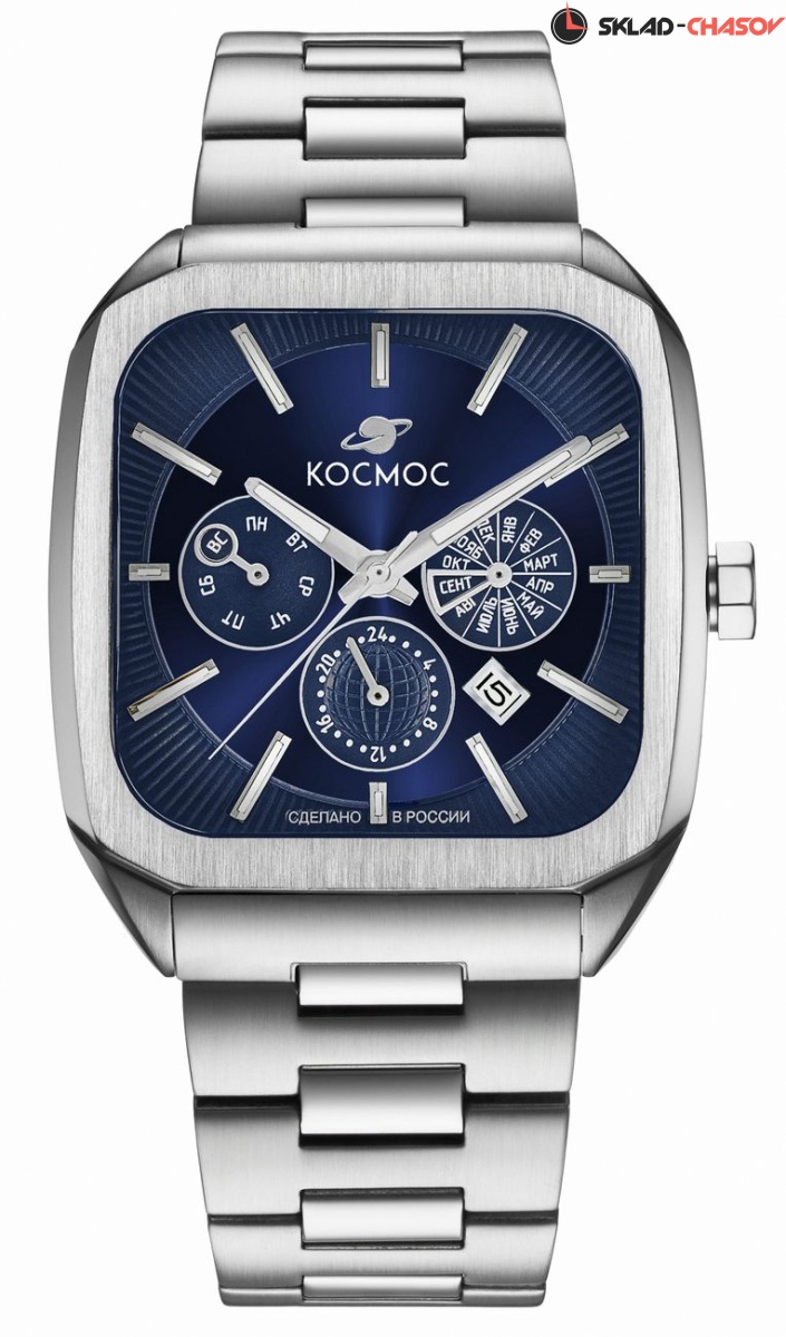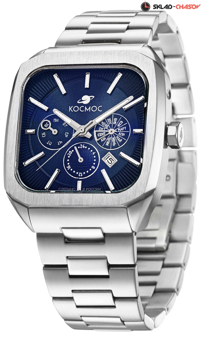 Корпус часов в форме квадрата с закругленными углами сделан из нержавеющей стали, украшенной зеркальной полировкой и сатинированием. Удобная заводная головка имеет форму гайки. Задняя крышка прозрачная, что традиционно для механических часов. Сквозь специальное окошко можно увидеть работу механизма Miyota. Его подвижный ротор не только позволяет заводить пружину механизма от обычных движений руки, но и несет важную информацию: на нем вы увидите надпись «Сделано в России». Украшением служит гравировка, изображающая космонавта. Задняя крышка крепится на четырех винтах, что обеспечивает повышенную водостойкость в 10 атмосфер (100 метров). Цифры в формате от 01/50 до 50/50 обозначают индивидуальный номер модели. Ушки корпуса имеют эргономичную форму — это позволяет часам комфортно лежать на запястье. Объемный циферблат синего цвета состоит из двух уровней. В центре первого движутся три стрелки, часовая и минутная - с люминесцентным покрытием. Также, здесь расположили три дополнительных индикатора, дающих информацию о дне недели, месяце и времени в формате 24-х часов. Для обозначения дня недели и месяца используется кириллица. Окошко даты между 4 и 5 часами выделено накладной рамкой. Второй уровень декорирован гильоше в виде солнечных лучей, на нем закреплены накладные индексы. Сапфировое стекло с антибликовым покрытием обеспечивает защиту циферблата и хорошую читаемость показаний, независимо от условий видимости.