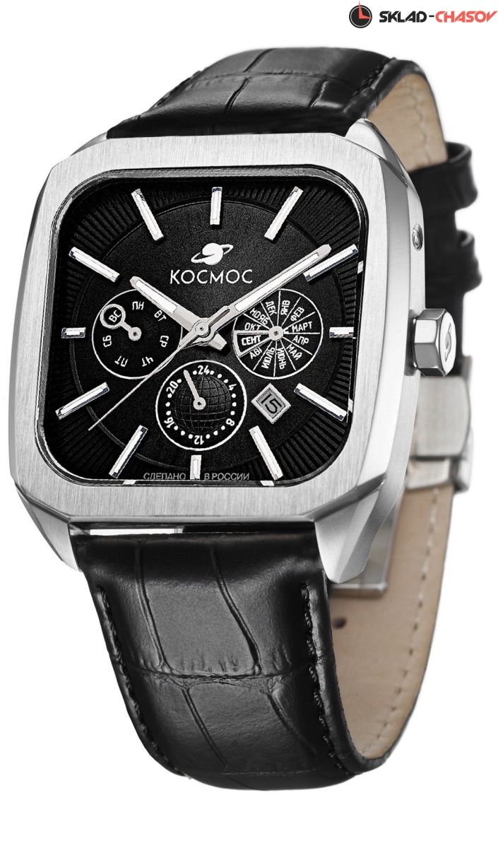 Корпус часов в форме квадрата с закругленными углами сделан из нержавеющей стали, украшенной зеркальной полировкой и сатинированием. Удобная заводная головка имеет форму гайки. Задняя крышка прозрачная, что традиционно для механических часов. Сквозь специальное окошко можно увидеть работу механизма Miyota. Его подвижный ротор не только позволяет заводить пружину механизма от обычных движений руки, но и несет важную информацию: на нем вы увидите надпись «Сделано в России». Украшением служит гравировка, изображающая космонавта. Задняя крышка крепится на четырех винтах, что обеспечивает повышенную водостойкость в 10 атмосфер (100 метров). Цифры в формате от 01/50 до 50/50 обозначают индивидуальный номер модели. Ушки корпуса имеют эргономичную форму — это позволяет часам комфортно лежать на запястье. Объемный циферблат черного цвета состоит из двух уровней. В центре первого движутся три стрелки, часовая и минутная - с люминесцентным покрытием. Также, здесь расположили три дополнительных индикатора, дающих информацию о дне недели, месяце и времени в формате 24-х часов. Для обозначения дня недели и месяца используется кириллица. Окошко даты между 4 и 5 часами выделено накладной рамкой. Второй уровень декорирован гильоше в виде солнечных лучей, на нем закреплены накладные индексы. Сапфировое стекло с антибликовым покрытием обеспечивает защиту циферблата и хорошую читаемость показаний, независимо от условий видимости.