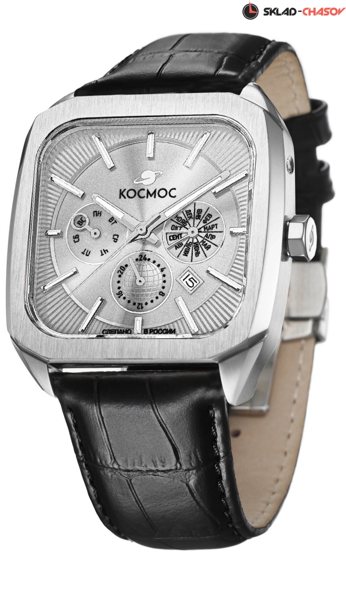 Корпус часов в форме квадрата с закругленными углами сделан из нержавеющей стали, украшенной зеркальной полировкой и сатинированием. Удобная заводная головка имеет форму гайки. Задняя крышка прозрачная, что традиционно для механических часов. Сквозь специальное окошко можно увидеть работу механизма Miyota. Его подвижный ротор не только позволяет заводить пружину механизма от обычных движений руки, но и несет важную информацию: на нем вы увидите надпись «Сделано в России». Украшением служит гравировка, изображающая космонавта. Задняя крышка крепится на четырех винтах, что обеспечивает повышенную водостойкость в 10 атмосфер (100 метров). Цифры в формате от 01/50 до 50/50 обозначают индивидуальный номер модели. Ушки корпуса имеют эргономичную форму — это позволяет часам комфортно лежать на запястье. Объемный циферблат белого цвета состоит из двух уровней. В центре первого движутся три стрелки, часовая и минутная - с люминесцентным покрытием. Также, здесь расположили три дополнительных индикатора, дающих информацию о дне недели, месяце и времени в формате 24-х часов. Для обозначения дня недели и месяца используется кириллица. Окошко даты между 4 и 5 часами выделено накладной рамкой. Второй уровень декорирован гильоше в виде солнечных лучей, на нем закреплены накладные индексы. Сапфировое стекло с антибликовым покрытием обеспечивает защиту циферблата и хорошую читаемость показаний, независимо от условий видимости.