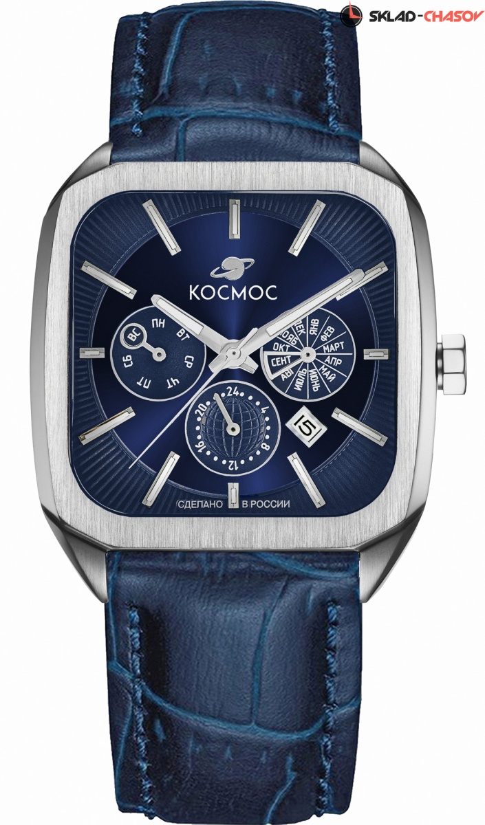 Корпус часов в форме квадрата с закругленными углами сделан из нержавеющей стали, украшенной зеркальной полировкой и сатинированием. Удобная заводная головка имеет форму гайки. Задняя крышка прозрачная, что традиционно для механических часов. Сквозь специальное окошко можно увидеть работу механизма Miyota. Его подвижный ротор не только позволяет заводить пружину механизма от обычных движений руки, но и несет важную информацию: на нем вы увидите надпись «Сделано в России». Украшением служит гравировка, изображающая космонавта. Задняя крышка крепится на четырех винтах, что обеспечивает повышенную водостойкость в 10 атмосфер (100 метров). Цифры в формате от 01/50 до 50/50 обозначают индивидуальный номер модели. Ушки корпуса имеют эргономичную форму — это позволяет часам комфортно лежать на запястье. Объемный циферблат синего цвета состоит из двух уровней. В центре первого движутся три стрелки, часовая и минутная - с люминесцентным покрытием. Также, здесь расположили три дополнительных индикатора, дающих информацию о дне недели, месяце и времени в формате 24-х часов. Для обозначения дня недели и месяца используется кириллица. Окошко даты между 4 и 5 часами выделено накладной рамкой. Второй уровень декорирован гильоше в виде солнечных лучей, на нем закреплены накладные индексы. Сапфировое стекло с антибликовым покрытием обеспечивает защиту циферблата и хорошую читаемость показаний, независимо от условий видимости.
