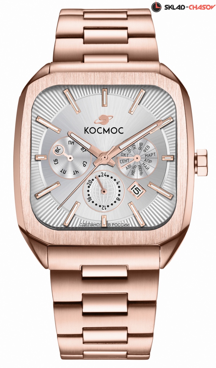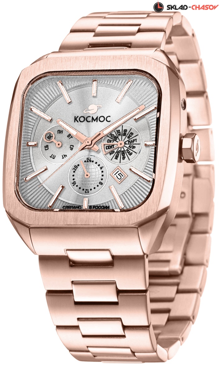 Корпус часов в форме квадрата с закругленными углами сделан из нержавеющей стали, украшенной PVD-покрытием из розового золота, зеркальной полировкой и сатинированием. Удобная заводная головка имеет форму гайки. Задняя крышка прозрачная, что традиционно для механических часов. Сквозь специальное окошко можно увидеть работу механизма Miyota. Его подвижный ротор не только позволяет заводить пружину механизма от обычных движений руки, но и несет важную информацию: на нем вы увидите надпись «Сделано в России». Украшением служит гравировка, изображающая космонавта. Задняя крышка крепится на четырех винтах, что обеспечивает повышенную водостойкость в 10 атмосфер (100 метров). Цифры в формате от 01/50 до 50/50 обозначают индивидуальный номер модели. Ушки корпуса имеют эргономичную форму — это позволяет часам комфортно лежать на запястье. Объемный циферблат белого цвета состоит из двух уровней. В центре первого движутся три стрелки, часовая и минутная - с люминесцентным покрытием. Также, здесь расположили три дополнительных индикатора, дающих информацию о дне недели, месяце и времени в формате 24-х часов. Для обозначения дня недели и месяца используется кириллица. Окошко даты между 4 и 5 часами выделено накладной рамкой. Второй уровень декорирован гильоше в виде солнечных лучей, на нем закреплены накладные индексы. Сапфировое стекло с антибликовым покрытием обеспечивает защиту циферблата и хорошую читаемость показаний, независимо от условий видимости.