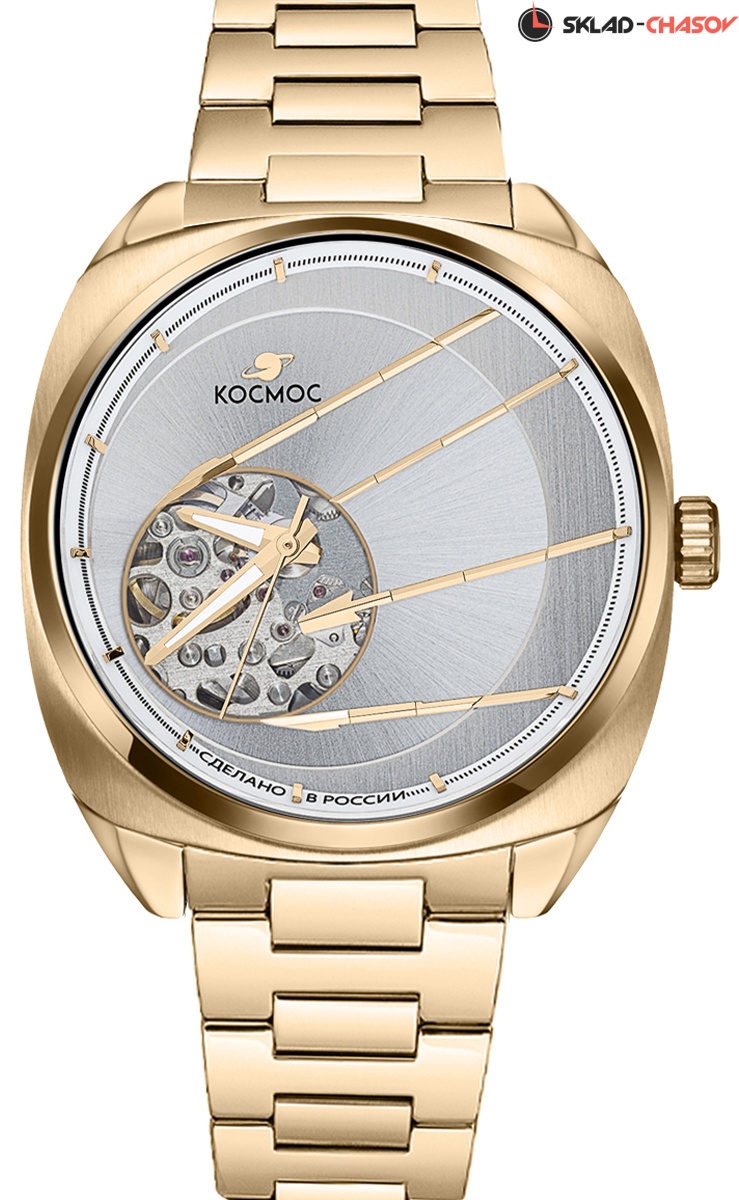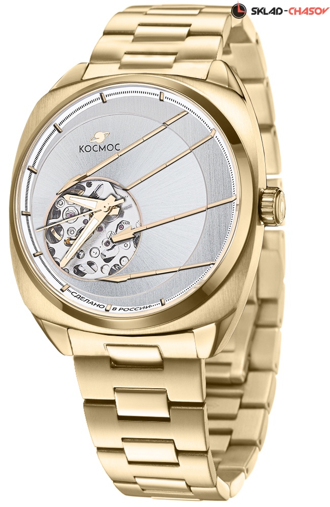 В корпусе необычной формы, сделанном из гипоаллергенной нержавеющей стали с PVD-покрытием из желтого золота, работает механизм Seiko с функцией автоподзавода. За его движением можно следить сквозь прозрачную заднюю крышку, надежно закрепленную на четырех винтах. Здесь же размещен и индивидуальный номер модели в формате хх/50. Украшением циферблата служит сочетание разных видов полировки и, конечно же, открытый баланс, окруженный декоративными элементами, отсылающими к антеннам Спутника. На этом фоне хорошо читаются крупные стрелки, часовая и минутная с люминесцентным покрытием. Для защиты белого циферблата установлено сапфировое стекло, которое надолго сохраняет свою прозрачность, стойко сопротивляясь появлению микроцарапин. Водостойкость равна 10 атмосфер. Корпус дополняет литой браслет из нержавеющей стали, из этого же материала выполнена и застежка-бабочка с двумя боковыми кнопками.