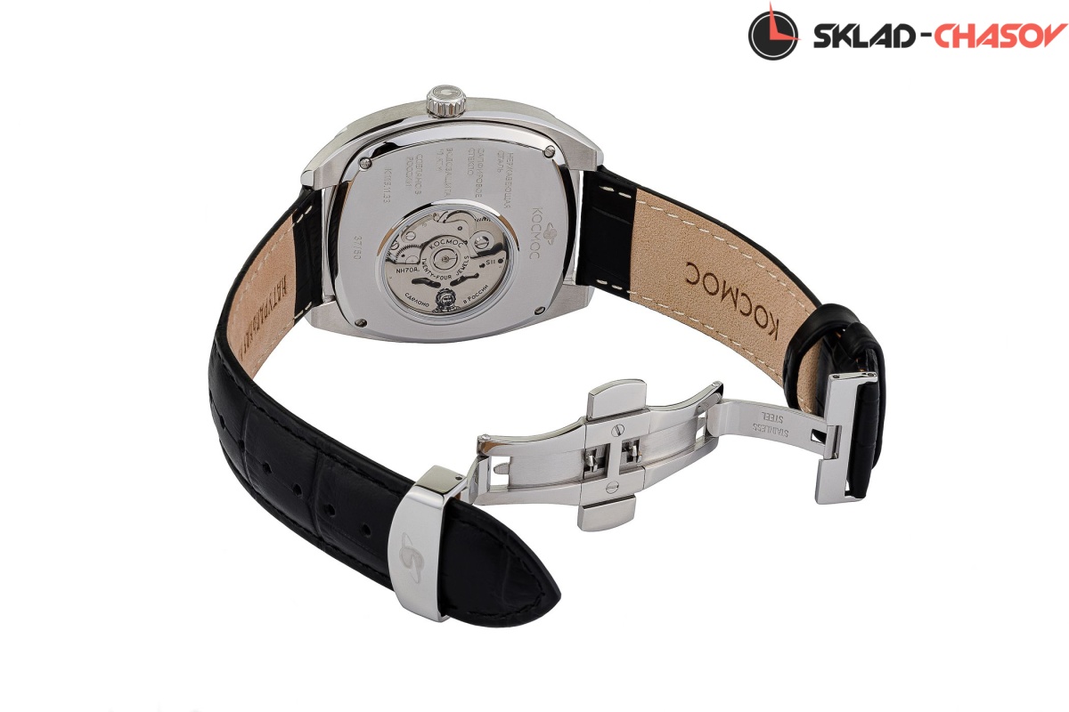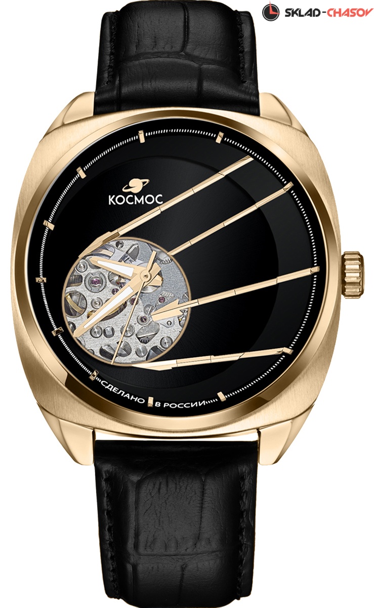 В корпусе необычной формы, сделанном из гипоаллергенной нержавеющей стали с PVD-покрытием из желтого золота, работает механизм Seiko с функцией автоподзавода. За его движением можно следить сквозь прозрачную заднюю крышку, надежно закрепленную на четырех винтах. Здесь же размещен и индивидуальный номер модели в формате хх/50. Украшением циферблата служит сочетание разных видов полировки и, конечно же, открытый баланс, окруженный декоративными элементами, отсылающими к антеннам Спутника. На этом фоне хорошо читаются крупные стрелки, часовая и минутная с люминесцентным покрытием. Для защиты черного циферблата установлено сапфировое стекло, которое надолго сохраняет свою прозрачность, стойко сопротивляясь появлению микроцарапин. Водостойкость равна 10 атмосфер. Корпус дополняет ремешок из натуральной кожи черного цвета, застежка-бабочка с двумя боковыми кнопками сделана из нержавеющей стали.