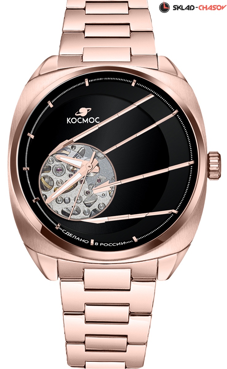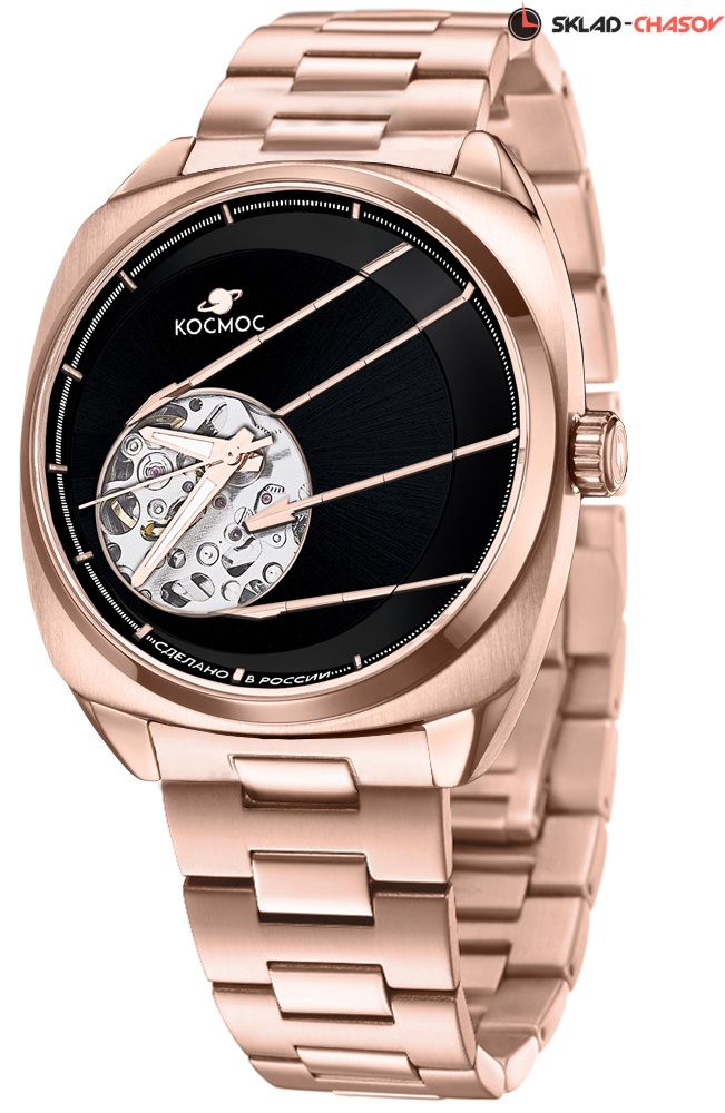 В корпусе необычной формы, сделанном из гипоаллергенной нержавеющей стали с PVD-покрытием из розового золота, работает механизм Seiko с функцией автоподзавода. За его движением можно следить сквозь прозрачную заднюю крышку, надежно закрепленную на четырех винтах. Здесь же размещен и индивидуальный номер модели в формате хх/50. Украшением циферблата служит сочетание разных видов полировки и, конечно же, открытый баланс, окруженный декоративными элементами, отсылающими к антеннам Спутника. На этом фоне хорошо читаются крупные стрелки, часовая и минутная с люминесцентным покрытием. Для защиты черного циферблата установлено сапфировое стекло, которое надолго сохраняет свою прозрачность, стойко сопротивляясь появлению микроцарапин. Водостойкость равна 10 атмосфер. Корпус дополняет литой браслет из нержавеющей стали, из этого же материала выполнена и застежка-бабочка с двумя боковыми кнопками.