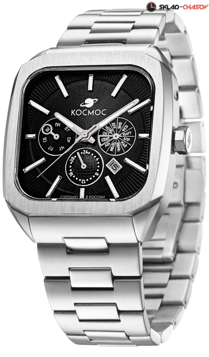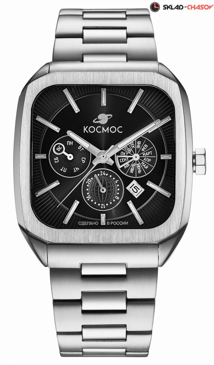 Корпус часов в форме квадрата с закругленными углами сделан из нержавеющей стали, украшенной зеркальной полировкой и сатинированием. Удобная заводная головка имеет форму гайки. Задняя крышка прозрачная, что традиционно для механических часов. Сквозь специальное окошко можно увидеть работу механизма Miyota. Его подвижный ротор не только позволяет заводить пружину механизма от обычных движений руки, но и несет важную информацию: на нем вы увидите надпись «Сделано в России». Украшением служит гравировка, изображающая космонавта. Задняя крышка крепится на четырех винтах, что обеспечивает повышенную водостойкость в 10 атмосфер (100 метров). Цифры в формате от 01/50 до 50/50 обозначают индивидуальный номер модели. Ушки корпуса имеют эргономичную форму — это позволяет часам комфортно лежать на запястье. Объемный циферблат черного цвета состоит из двух уровней. В центре первого движутся три стрелки, часовая и минутная - с люминесцентным покрытием. Также, здесь расположили три дополнительных индикатора, дающих информацию о дне недели, месяце и времени в формате 24-х часов. Для обозначения дня недели и месяца используется кириллица. Окошко даты между 4 и 5 часами выделено накладной рамкой. Второй уровень декорирован гильоше в виде солнечных лучей, на нем закреплены накладные индексы. Сапфировое стекло с антибликовым покрытием обеспечивает защиту циферблата и хорошую читаемость показаний, независимо от условий видимости.