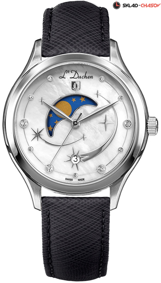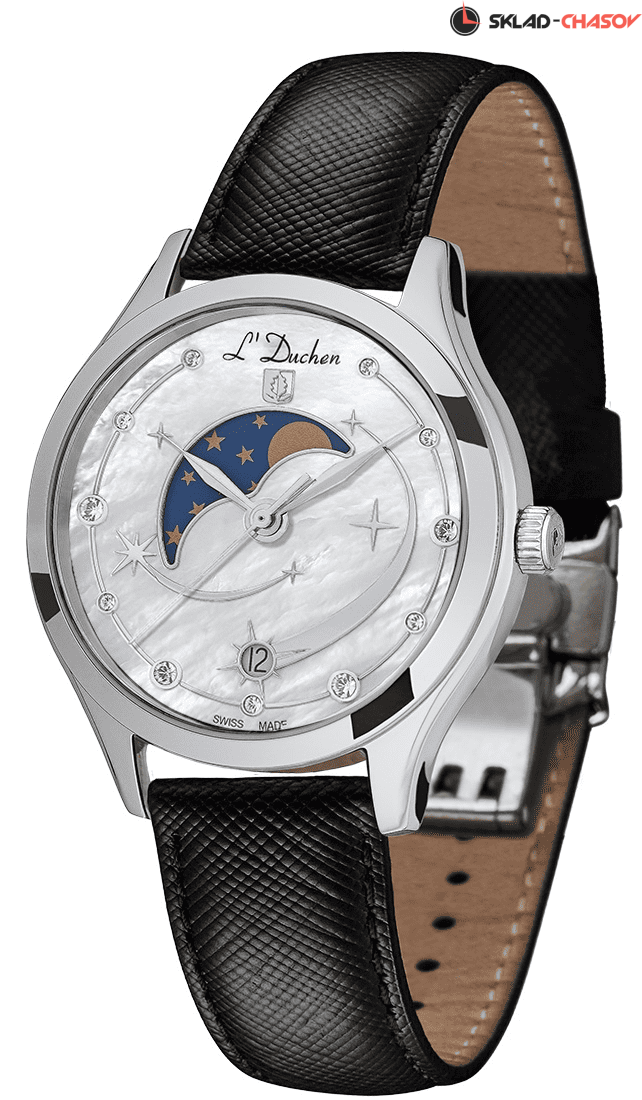 Волшебство кварцевых часов серии Perseides в уникальном циферблате черного цвета из натурального перламутра, рисунок которого создан самой природой. Этот материал служит фоном хорошо читаемым стрелкам часов, минут и секунд. Накладные элементы в виде падающих звезд символизируют «персеиды» - метеорный поток, давший название коллекции. В один из них органично вписано круглое окошко даты. Украшением модели служит индикатор фаз Луны, выделенный металлической рамкой. Особое сияние циферблату придают фианиты разного размера. Корпус сделан из прочной нержавеющей стали с чередованием полированных и матовых элементов. Его дополняет сапфировое стекло, прозрачное и стойкое к появлению микроцарапин. Часы установлены на черный ремешок из натуральной кожи с сафьяновым тиснением. Застежка-бабочка удобна в использовании и поможет предотвратить падение часов при случайном расстегивании. На застежке, задней крышке и заводной головке выгравировано изображение дубового листа — логотипа бренда L’Duchen. Часы серии Perseides подчеркнут вашу индивидуальность независимо от выбранного образа.