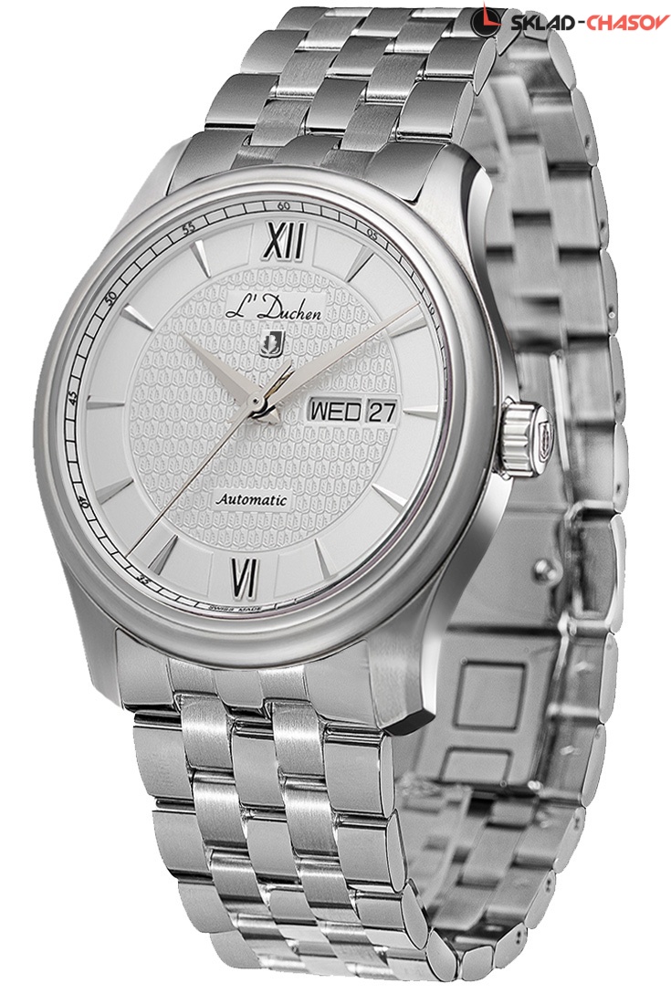 В качестве материала корпуса была выбрана нержавеющая сталь. Этот прочный материал известен своими гипоаллергенными свойствами – он идеально подходит для ежедневного использования. Безель по форме напоминает два последовательно расположенных кольца, большего и меньшего диаметра, эффектно обрамляющих белый циферблат. Для декора центральной зоны циферблата был выбран оригинальный рисунок гильоше: паттерн сложен из многократно повторяющегося изображения дубового листа – логотипа бренда. На его фоне хорошо читаются крупные часовая и минутная стрелки с гранями. Их изящную форму в чем-то повторяют накладные риски из стали. В позиции «3 часа» расположены индикаторы даты и дня недели. Особый объем циферблату придает дополнительный «колодец» по внутренней части, на который нанесена маркировка секунд. Сверху циферблат закрывает практически невидимое, но очень надежное сапфировое стекло с антибликовым покрытием. Оно позволит надолго сохранить внешний вид часов, успешно сопротивляясь появлению микроцарапин. Задняя крышка закреплена на четырех винтах. Сквозь прозрачное окошко можно наблюдать за работой швейцарского механизма Sellita с функцией автоподзавода. Водостойкость составляет 5 атмосфер. Браслет часов состоит из стальных звеньев. Его структуру подчеркивает чередование зеркальной полировки и матирования. В модели установлена удобная в использовании застежка-бабочка. На застежку, как и на заводную головку часов, нанесен логотип L`Duchen в виде дубового листа – символа мудрости и долговечности.