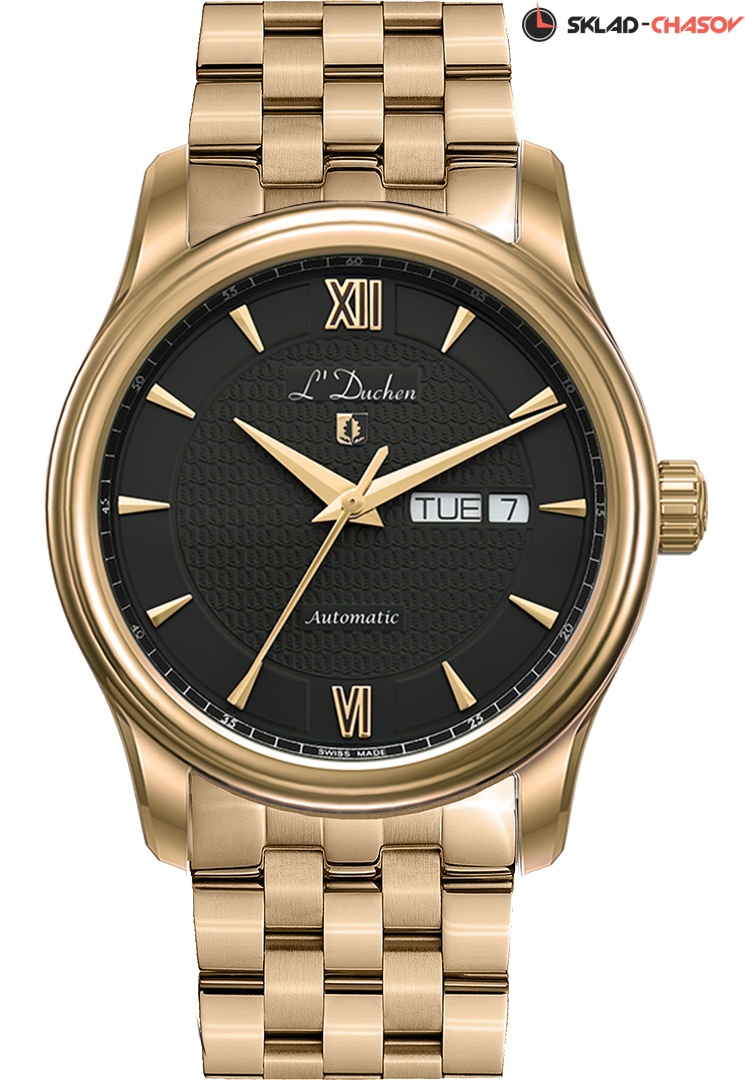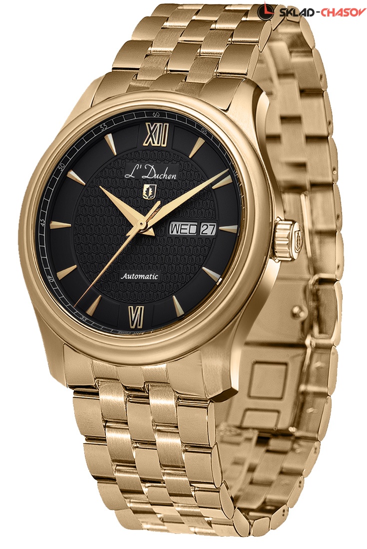 В качестве материала корпуса была выбрана нержавеющая сталь. Этот прочный материал известен своими гипоаллергенными свойствами – он идеально подходит для ежедневного использования. Сталь украшена PVD-покрытием из розового золота. Для декора центральной зоны циферблата был выбран оригинальный рисунок гильоше: паттерн сложен из многократно повторяющегося изображения дубового листа – логотипа бренда. На его фоне хорошо читаются крупные часовая и минутная стрелки с гранями. Их изящную форму в чем-то повторяют накладные риски из стали. В позиции «3 часа» расположены индикаторы даты и дня недели. Особый объем циферблату черного цвета придает дополнительный «колодец» по внутренней части, на который нанесена маркировка секунд. Сверху циферблат закрывает практически невидимое, но очень надежное сапфировое стекло. Оно позволит надолго сохранить внешний вид часов, успешно сопротивляясь появлению микроцарапин. Задняя крышка закреплена на винтах. Сквозь прозрачное окошко можно наблюдать за работой швейцарского механизма ETA с функцией автоподзавода. Все его детали родированы, а ротор декорирован классическим узором Cotes de Geneve («женевские полосы»). Плотный ремешок выполнен из натуральной кожи черного цвета с прошивкой, что повышает его износостойкость. В модели установлена удобная в использовании застежка-бабочка. На застежку, как и на заводную головку часов, нанесен логотип L`Duchen в виде дубового листа – символа мудрости и долговечности.