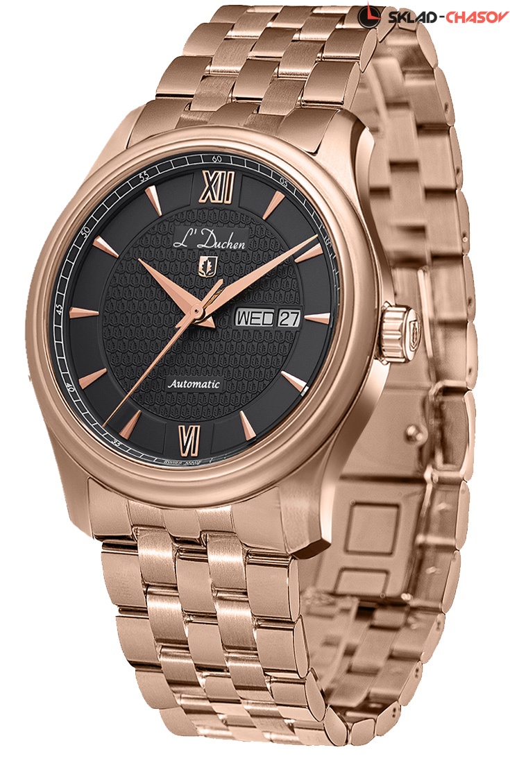 В качестве материала корпуса была выбрана нержавеющая сталь. Этот прочный материал известен своими гипоаллергенными свойствами – он идеально подходит для ежедневного использования. Безель по форме напоминает два последовательно расположенных кольца, большего и меньшего диаметра, эффектно обрамляющих черный циферблат. Нержавеющая сталь дополнена PVD-покрытием из розового золота. Для декора центральной зоны циферблата был выбран оригинальный рисунок гильоше: паттерн сложен из многократно повторяющегося изображения дубового листа – логотипа бренда. На его фоне хорошо читаются крупные часовая и минутная стрелки с гранями. Их изящную форму в чем-то повторяют накладные риски из стали. В позиции «3 часа» расположены индикаторы даты и дня недели. Особый объем циферблату придает дополнительный «колодец» по внутренней части, на который нанесена маркировка секунд. Сверху циферблат закрывает практически невидимое, но очень надежное сапфировое стекло с антибликовым покрытием. Оно позволит надолго сохранить внешний вид часов, успешно сопротивляясь появлению микроцарапин. Задняя крышка закреплена на четырех винтах. Сквозь прозрачное окошко можно наблюдать за работой швейцарского механизма Sellita с функцией автоподзавода. Водостойкость составляет 5 атмосфер. Браслет часов состоит из стальных звеньев. Его структуру выгодно подчеркивает чередование зеркальной полировки и матирования. В модели установлена удобная в использовании застежка-бабочка. На застежку, как и на заводную головку часов, нанесен логотип L`Duchen в виде дубового листа – символа мудрости и долговечности.
