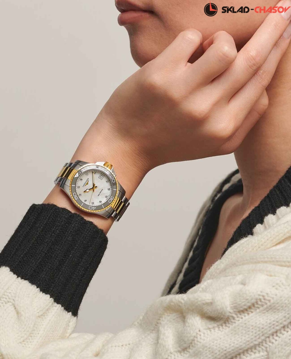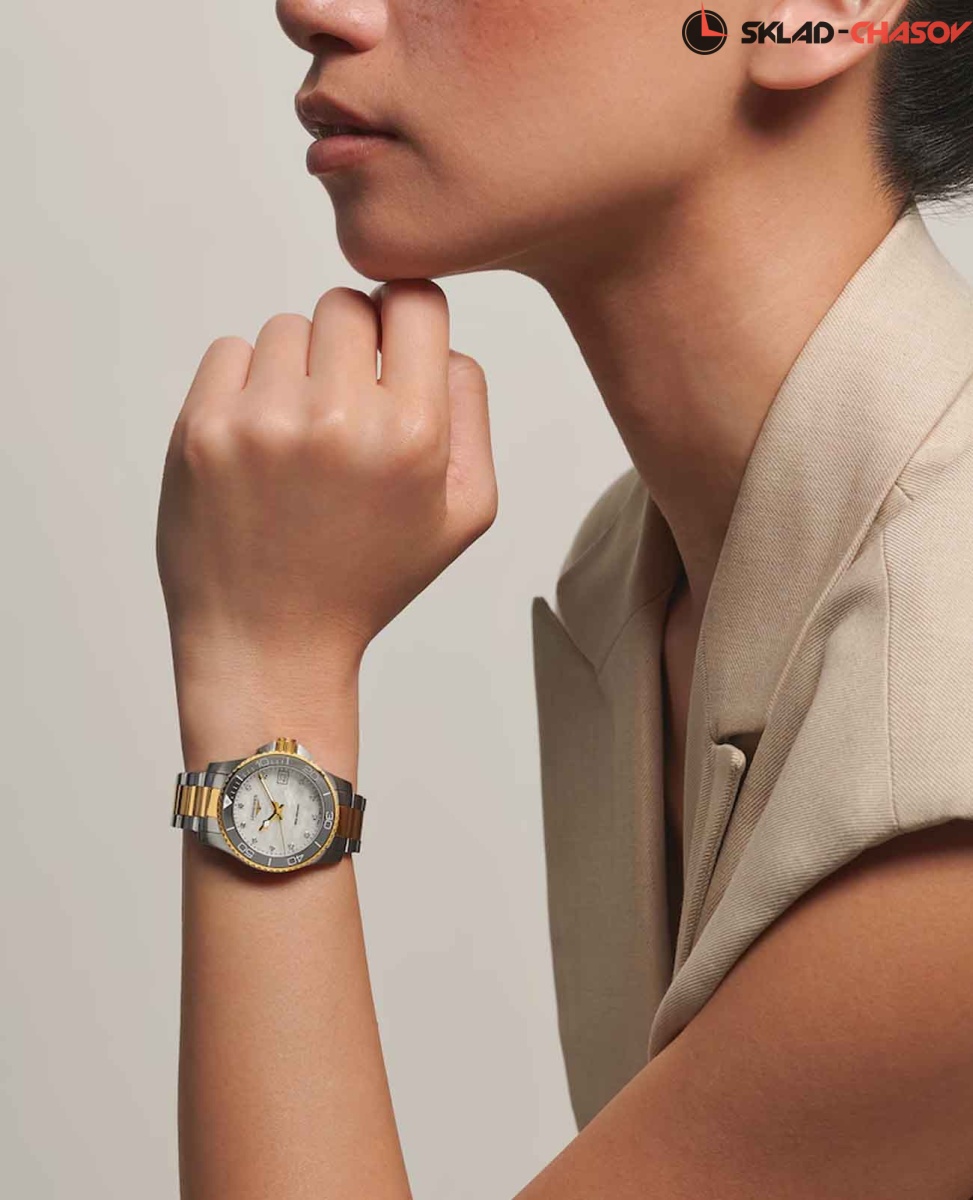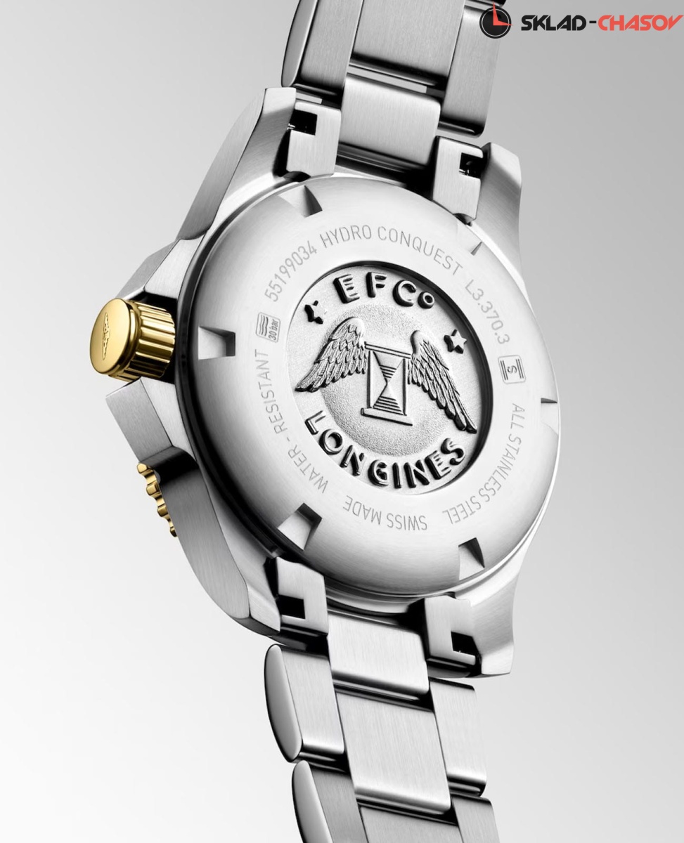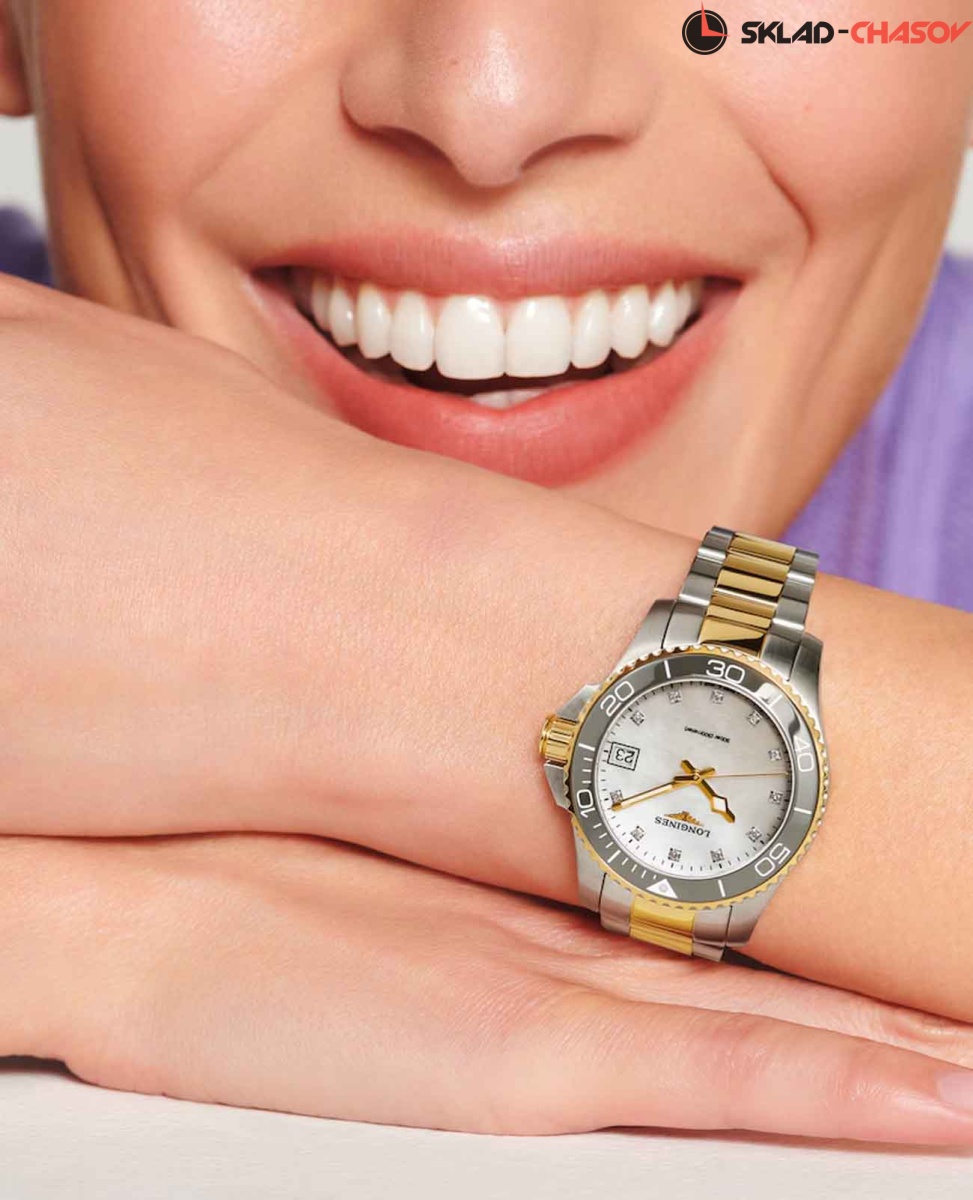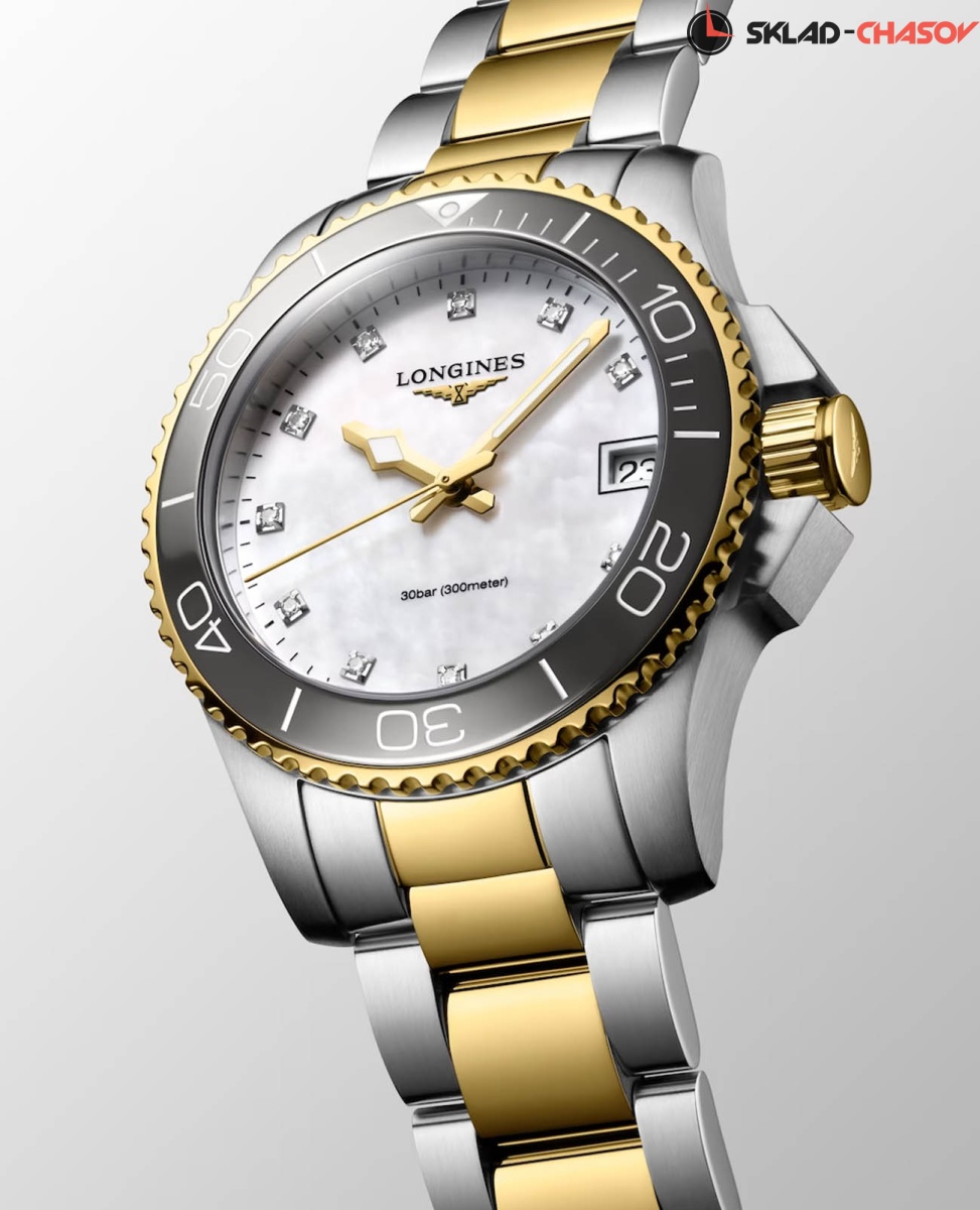 Женские швейцарские часы для дайвинга Longines HydroConquest L3.370.3.87.6, кварцевый механизм с высокой точностью. Сапфировое стекло с многослойным антибликовым покрытием с обеих сторон, устойчивое к появлению царапин, обладающее высокой прозрачностью. Корпус часов изготовлен из стали. Вращающийся безель из стали с PVD-покрытием и керамики, защищенный от царапин, никогда не изнашивается и не выцветает. Циферблат с 11 бриллиантами группы Top Wesselton VS-SI общим весом 0.044 карата. Стрелки и метки с люминесцентным покрытием. Окошко даты находится в положении 3 часов. Класс водозащиты: 300 метров, позволит плавать, нырять и заниматься другими водными видами спорта. Стальной браслет с частичным PVD-покрытием на раскладной застёжке.