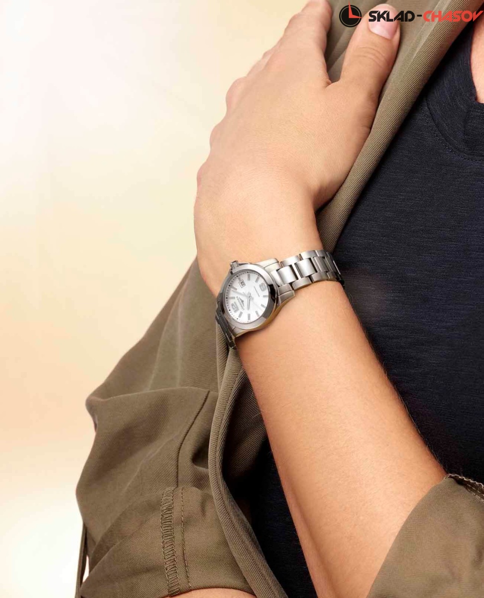 Водонепроницаемость класса 30 метров обеспечит защиту от случайных брызг или капель дождя, сохраняя часы в безопасности в течение всего рабочего дня. Завершает композицию стальной браслет с застёжкой «бабочка»