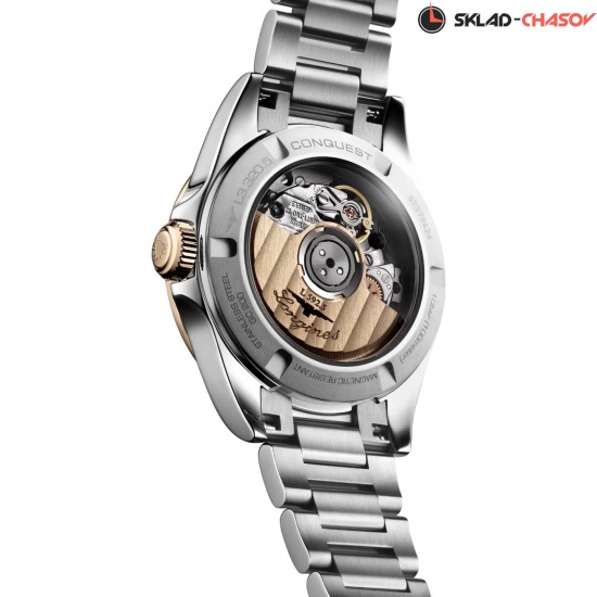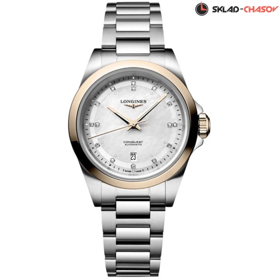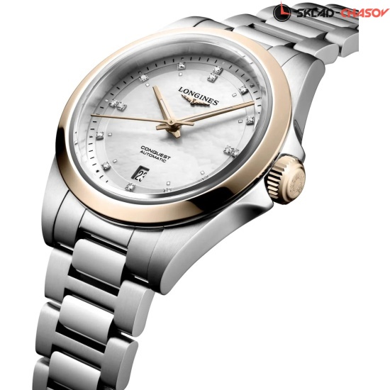 Longines Conquest — женственные и выразительные часы, в которых строгость современной классики сочетается с благородной двухтональной отделкой. Корпус диаметром 34 мм изготовлен из нержавеющей стали и дополнен изящным безелем из 18-каратного розового золота, создающим тёплый контраст и подчёркивающим премиальный характер модели.