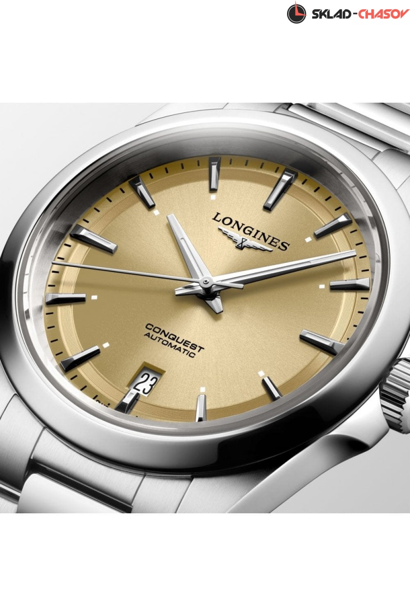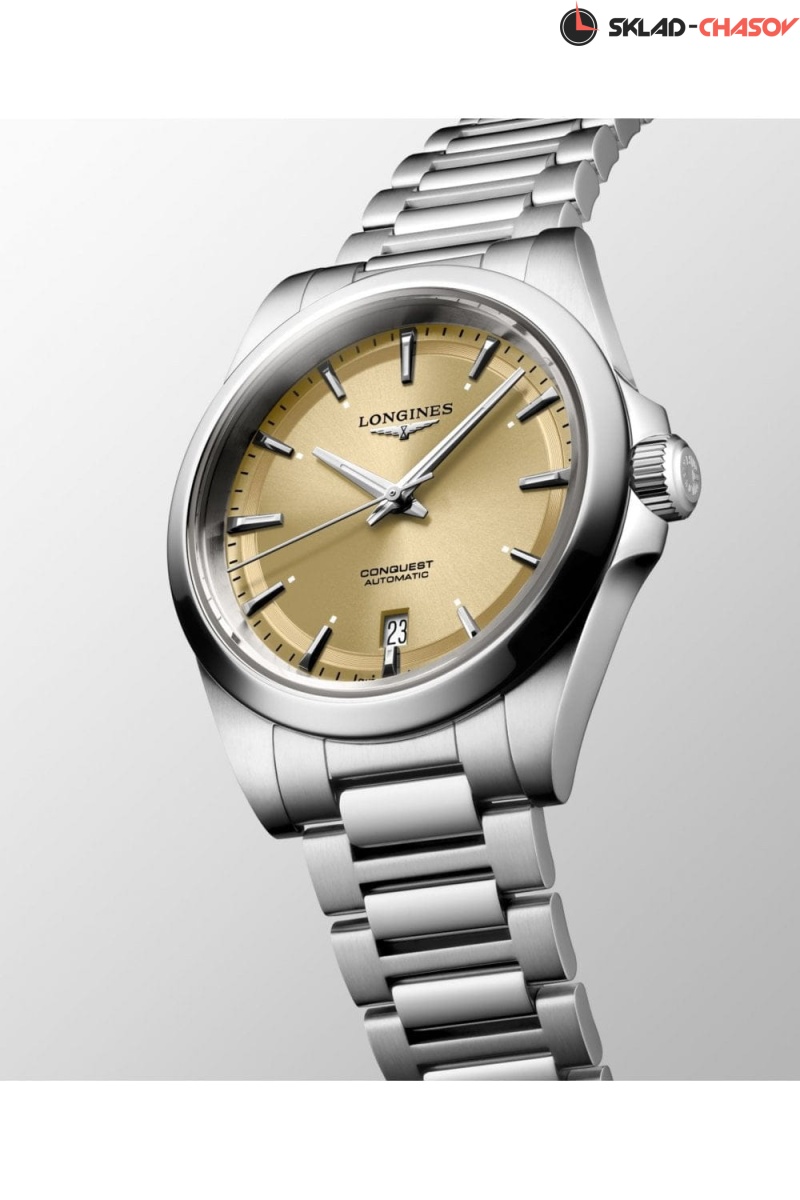 Женские швейцарские механические часы с автоподзаводом Longines Conquest L3.720.4.62.6. Сапфировое стекло устойчивое к появлению царапин, обладающее высокой прозрачностью. Корпус часов изготовлен из нержавеющей стали. Циферблат выполнен по технологии Sunray (солнечные лучи). Стрелки с люминесцентным покрытием. Окошко даты в положении 6 часов. Прозрачная задняя крышка. Класс водозащиты: 100 метров, позволит плавать, нырять и заниматься другими водными видами спорта. Стальной браслет на застёжке-бабочке с кнопками.