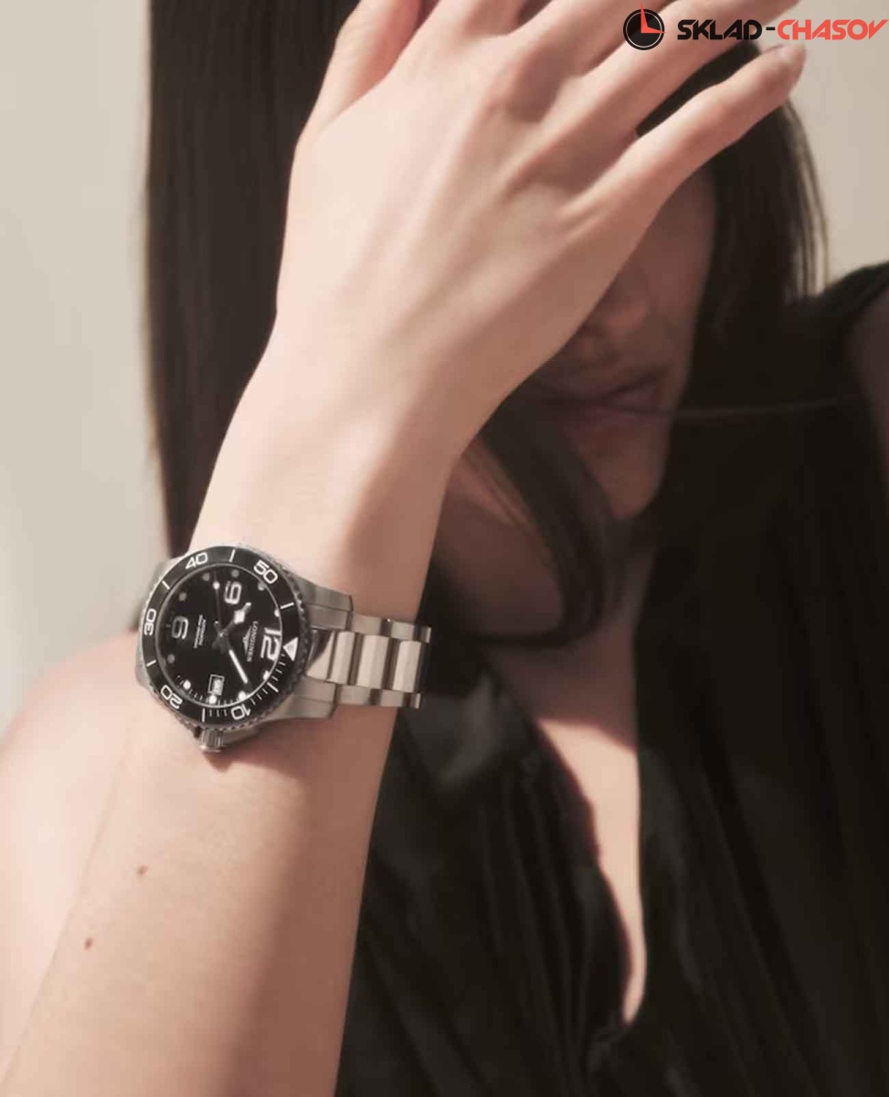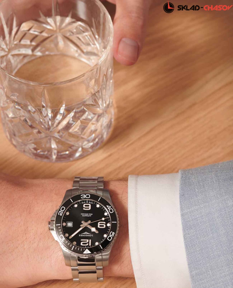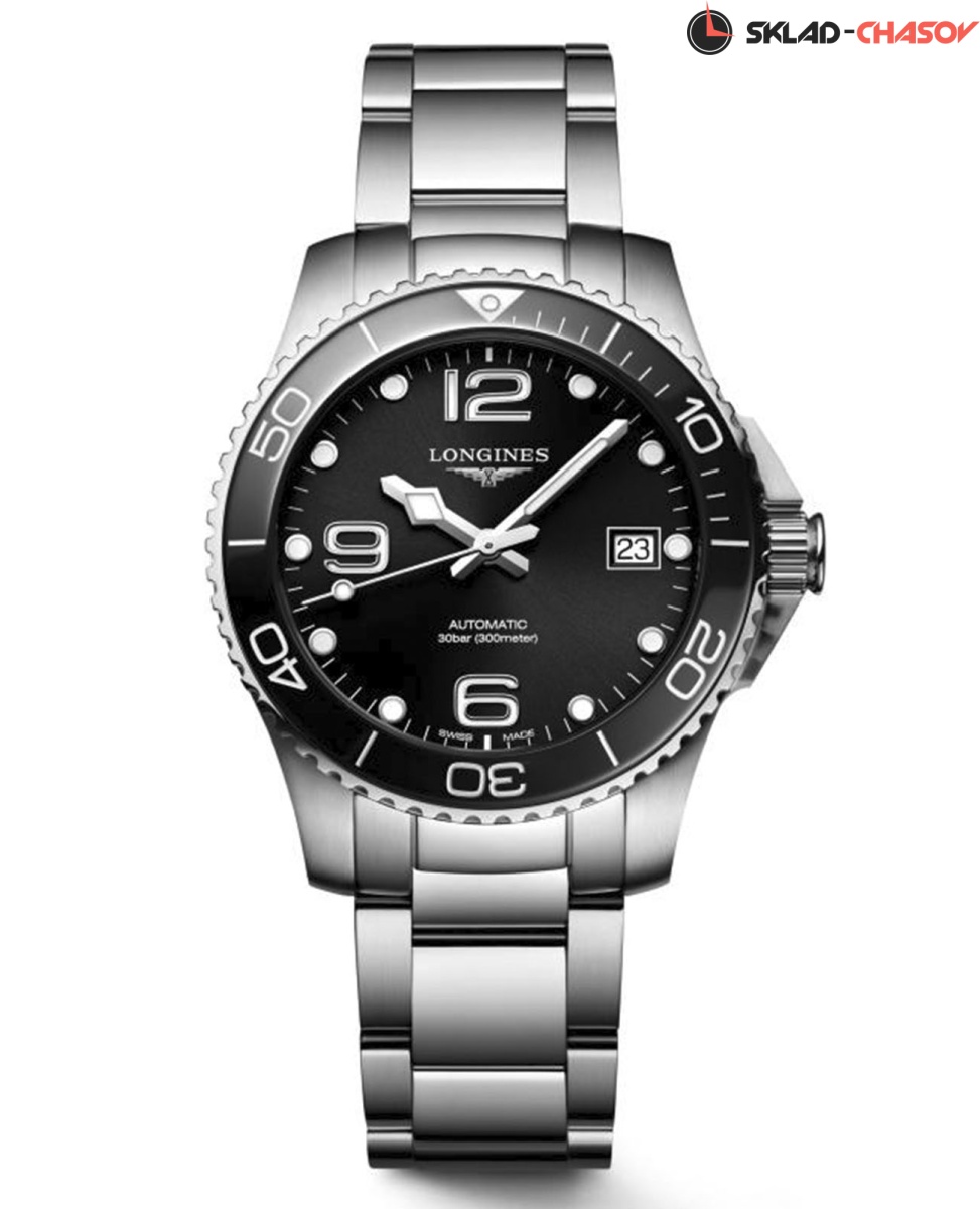 Швейцарские механические часы для дайвинга Longines HydroConquest L3.780.4.56.6. Сапфировое стекло с многослойным антибликовым покрытием с обеих сторон, устойчивое к появлению царапин, обладающее высокой прозрачностью. Корпус часов изготовлен из стали. Вращающийся безель из стали и керамики, защищенный от царапин, никогда не изнашивается и не выцветает. Стрелки и метки с люминесцентным покрытием. Окошко даты находится в положении 3 часов. Класс водозащиты: 300 метров, позволит плавать, нырять и заниматься другими водными видами спорта. Стальной браслет на раскладной застёжке.