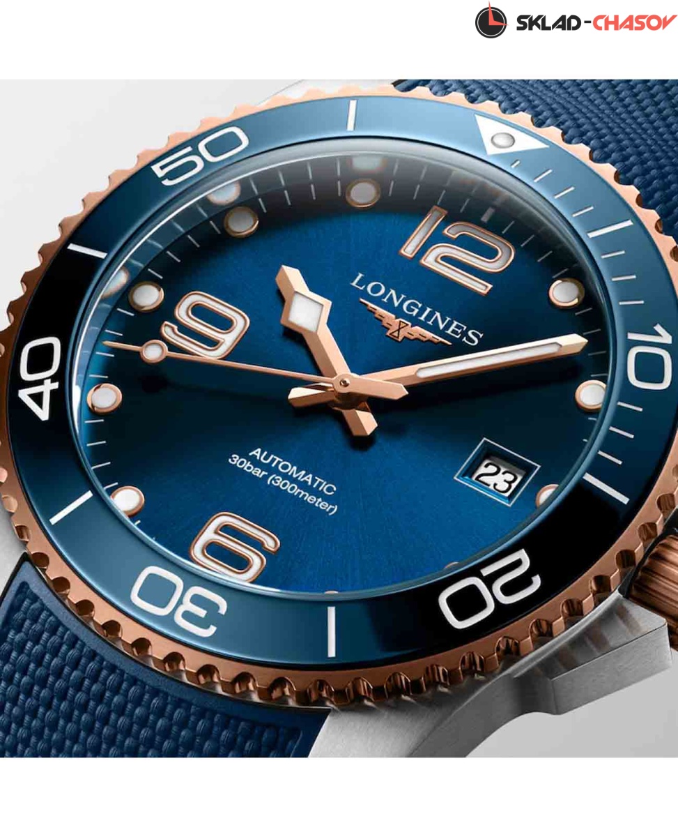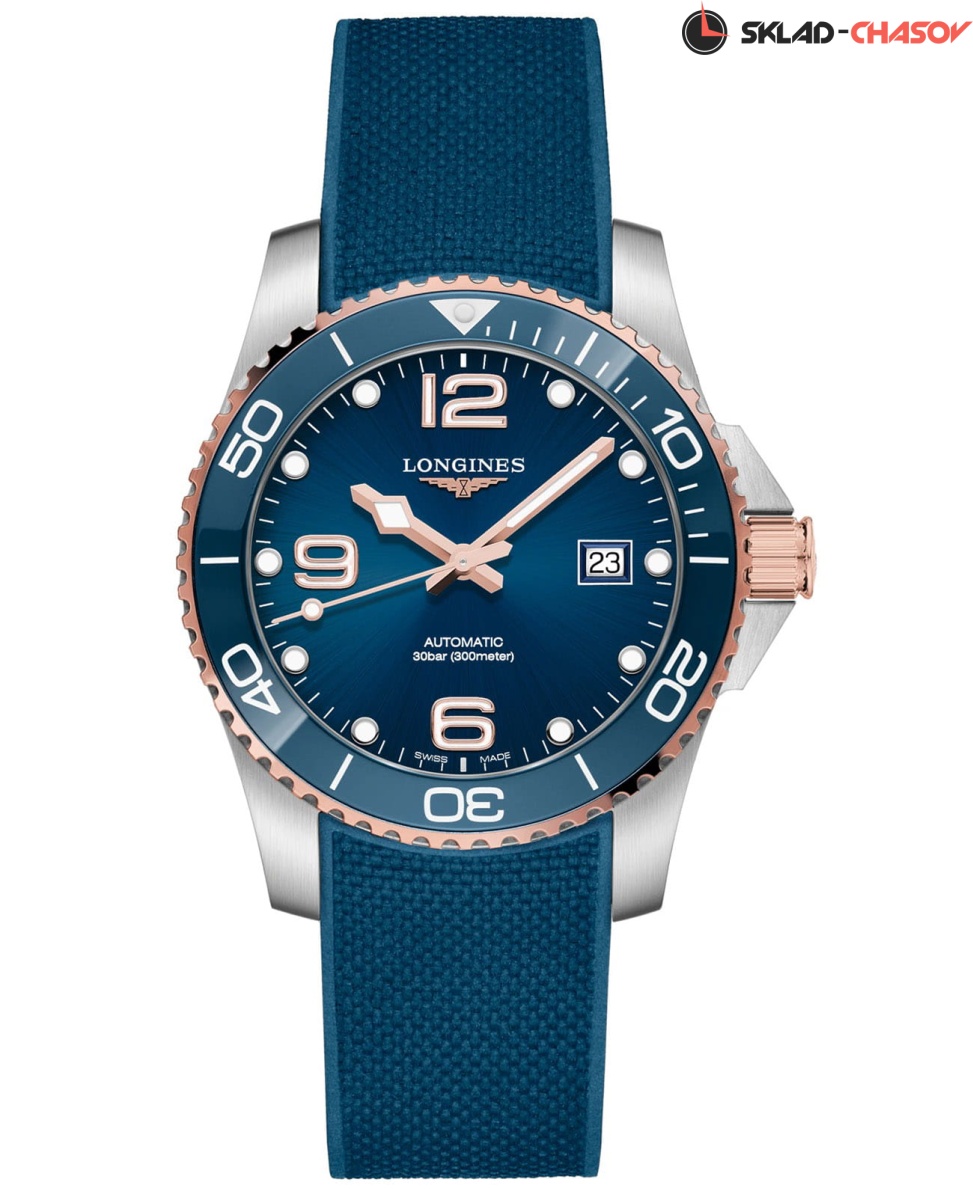 Мужские механические швейцарские часы с автоподзаводом Longines HydroConquest L3.781.3.98.9. Сапфировое стекло с антибликовым покрытием, устойчивое к мелким механическим повреждениям. Корпус часов изготовлен из нержавеющей стали. Вращающийся стальной безель с люминесцентным покрытием Superluminova из нержавеющей стали с PVD-покрытием и керамики, защищенный от царапин, никогда не изнашивается и не выцветает. Стрелки и метки с люминесцентным покрытием. Окошко даты находится в положении 3 часа. Класс водозащиты: 300 метров, позволит плавать, нырять и заниматься другими водными видами спорта. Каучуковый ремешок на раскладной застёжке с удлинением для дайверов.