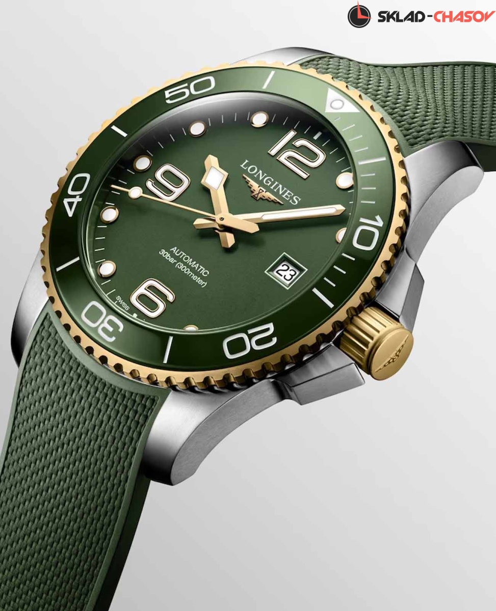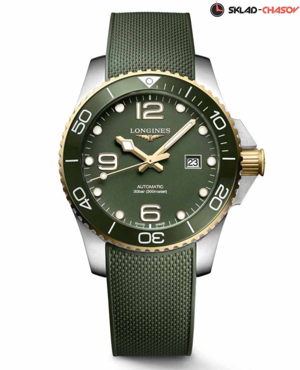 Мужские швейцарские механические часы для дайвинга Longines Hydroconquest L3.782.3.06.9. Сапфировое стекло с многослойным антибликовым покрытием с обеих сторон, устойчивое к появлению царапин, обладающее высокой прозрачностью. Корпус часов изготовлен из стали. Вращающийся безель из стали с PVD-покрытием и керамики, защищенный от царапин, никогда не изнашивается и не выцветает. Стрелки и метки с люминесцентным покрытием. Окошко даты находится в положении 3 часов. Класс водозащиты: 300 метров, позволит плавать, нырять и заниматься другими водными видами спорта. Каучуковый ремешок на раскладной застёжке.