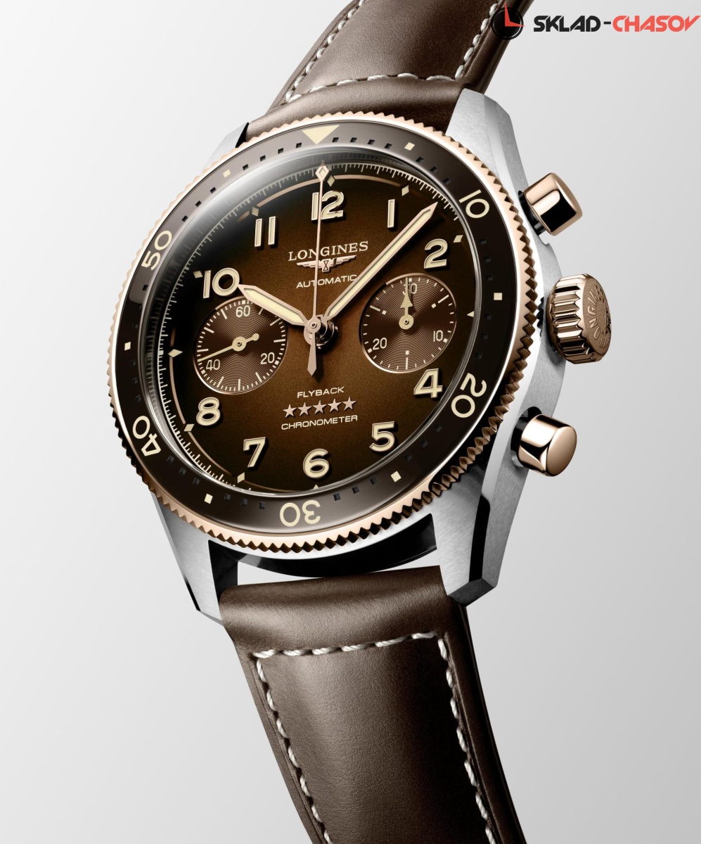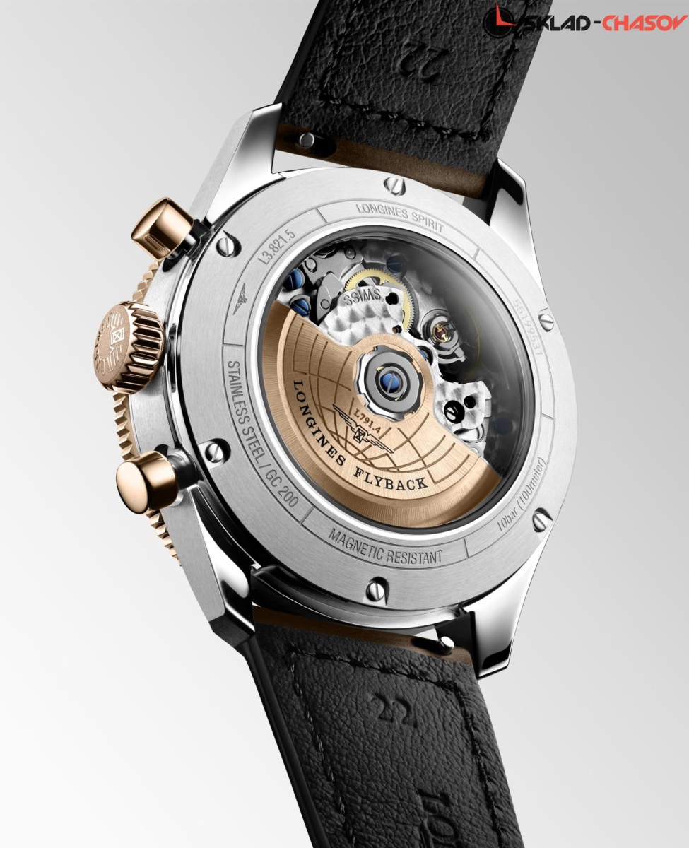 Коллекция Longines Spirit представляет хронограф с усложнением Flyback, созданный в честь легендарных авиаторов — первых испытателей часов Longines. В основе модели лежит новый эксклюзивный автоматический калибр, сертифицированный институтом COSC. Механизм оснащён устойчивой к магнетизму кремниевой пружиной баланса и обладает запасом хода 68 часов. Циферблат защищён сапфировым стеклом с двусторонним антибликовым покрытием и дополнен люминесцентными элементами. На прозрачной задней крышке, открывающей вид на механизм, размещён персонализированный ротор с гравировкой в виде земного шара — символом коллекции Spirit и надписью Longines Flyback. Этот хронограф сочетает в себе инновации, проверенную надёжность и наследие авиационной истории бренда.