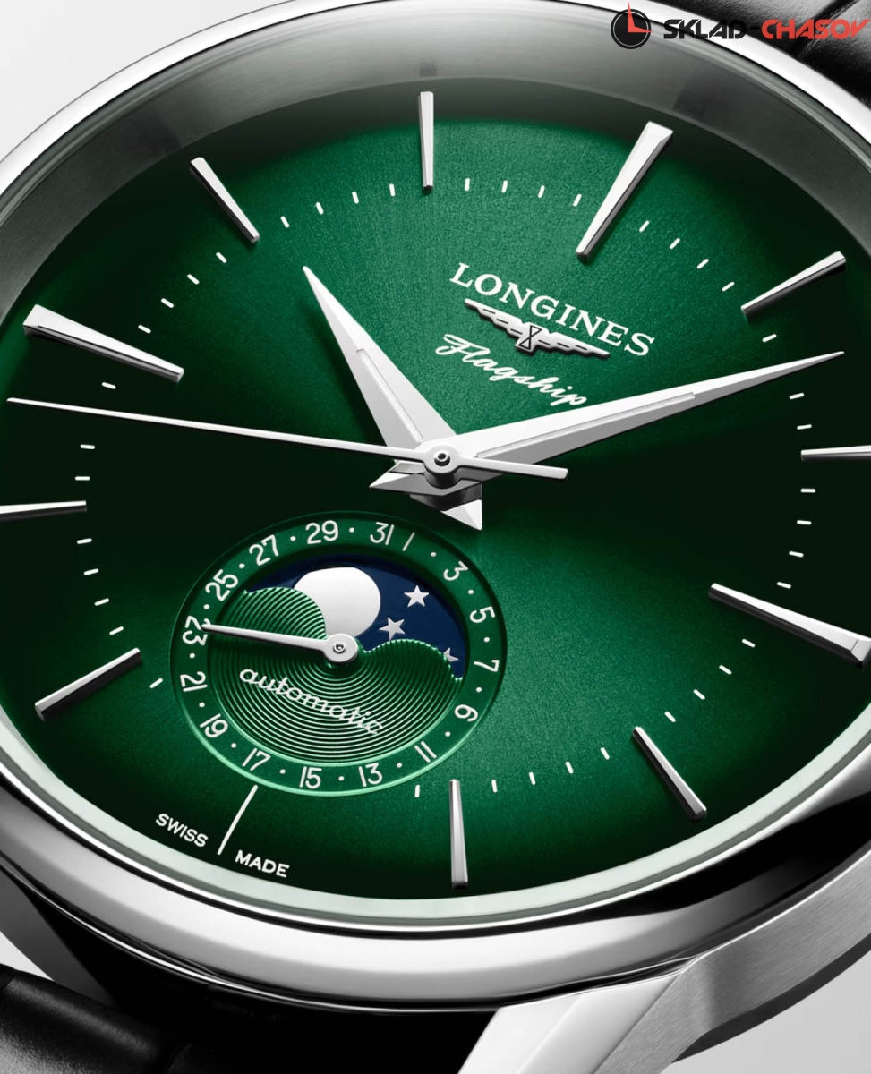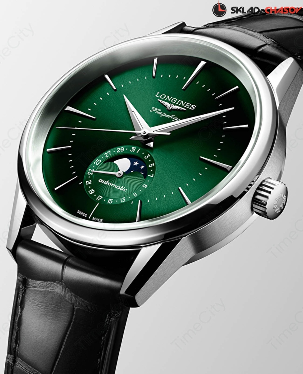 Мужские швейцарские механические часы с автоподзаводом Longines Flagship Heritage L4.815.4.02.2. Корпус часов изготовлен из нержавеющей стали. Сапфировое стекло повышенной прозрачности, устойчивое к мелким механическим повреждениям. Дата и индикатор фазы луны на дополнительном циферблате. Стрелки с люминесцентным покрытием Super-LumiNova. Класс водозащиты: 30 метров, позволит защитить корпус от случайных брызг или капель дождя. Ремешок из кожи аллигатора на стандартной застёжке.