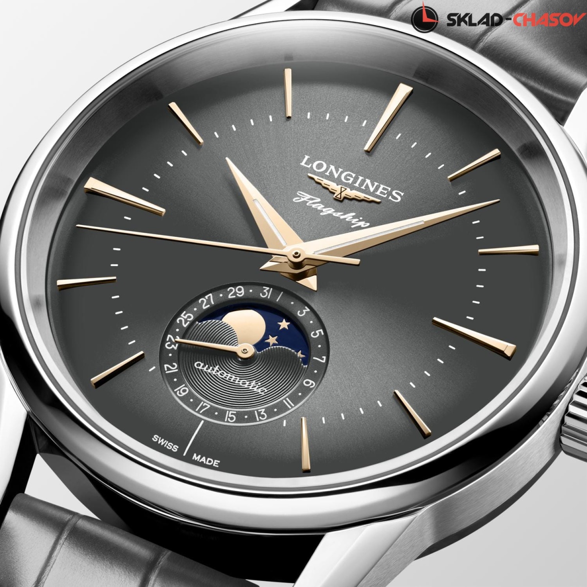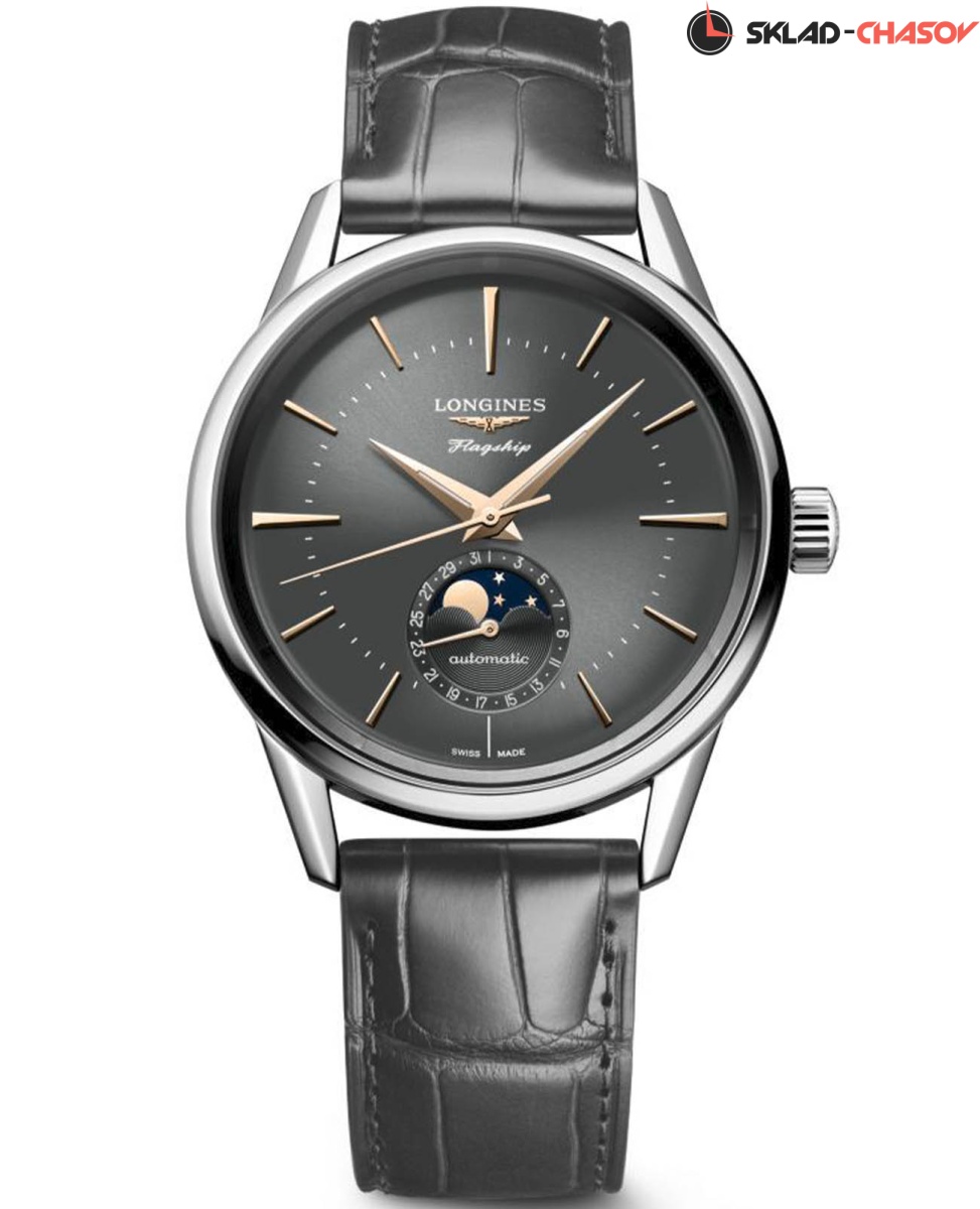Мужские швейцарские механические часы с автоподзаводом Longines Flagship Heritage L4.815.4.52.2. Корпус часов изготовлен из нержавеющей стали. Сапфировое стекло повышенной прозрачности, устойчивое к мелким механическим повреждениям. Дата и индикатор фазы луны на дополнительном циферблате. Стрелки с люминесцентным покрытием Super-LumiNova. Класс водозащиты: 30 метров, позволит защитить корпус от случайных брызг или капель дождя. Ремешок из кожи аллигатора на стандартной застёжке.