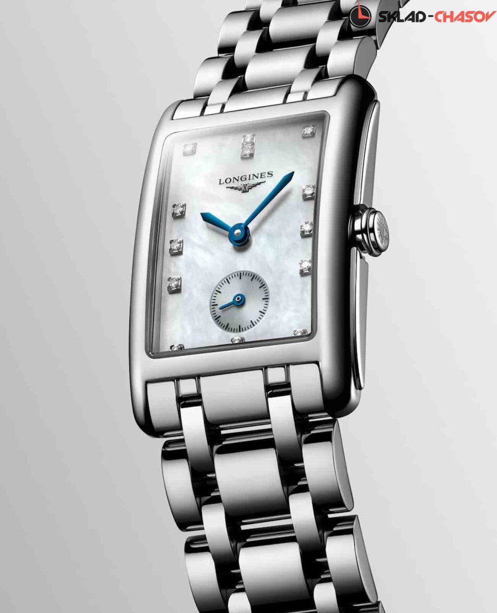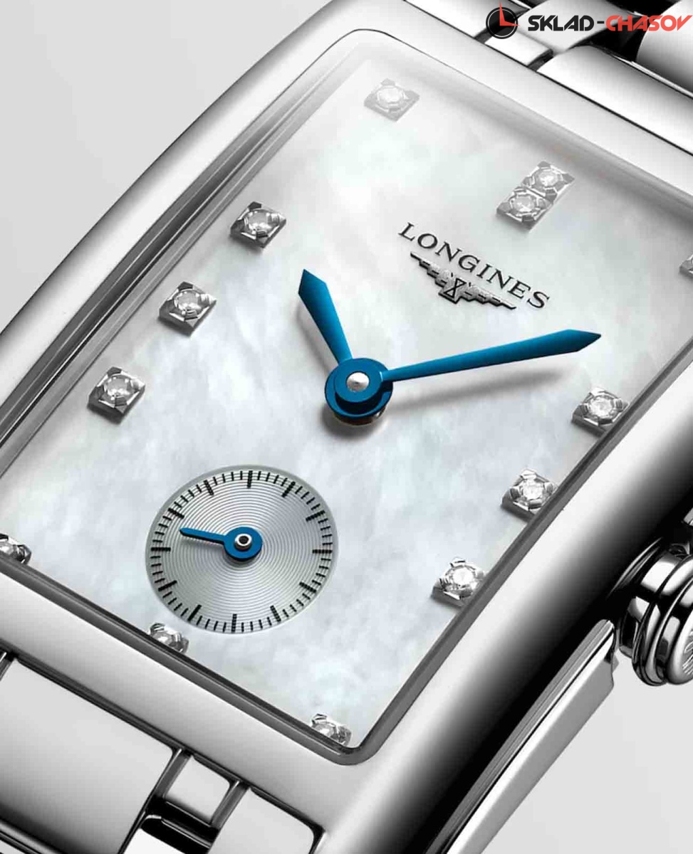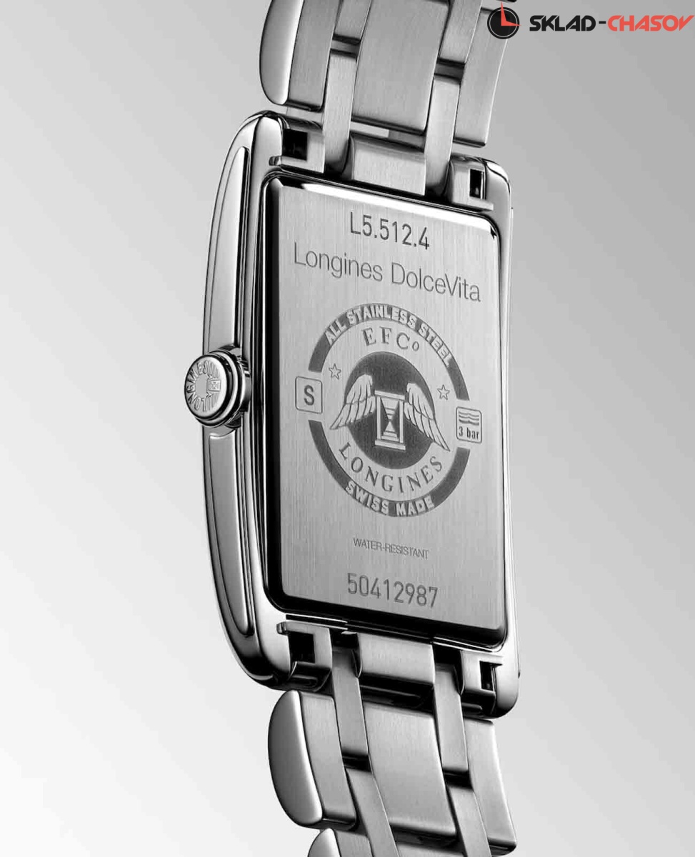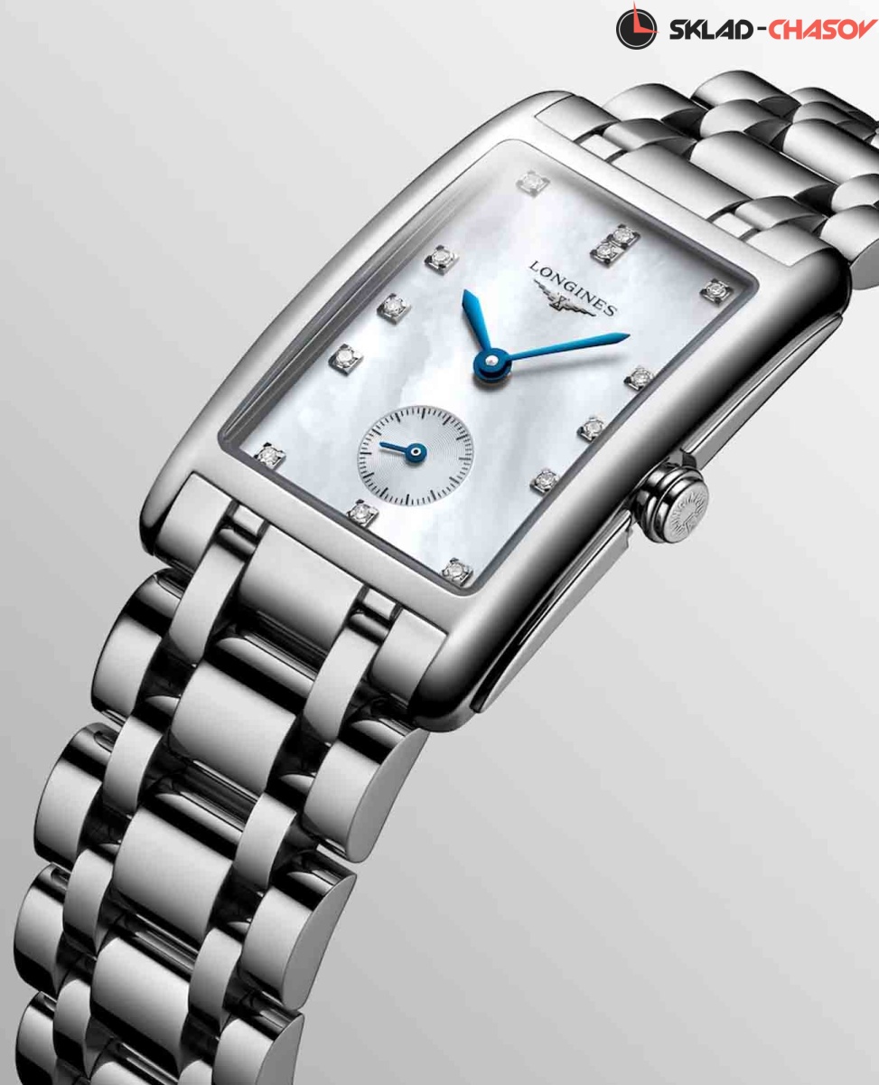Женские швейцарские часы Longines DolceVita L5.512.4.87.6, кварцевый механизм с высокой точностью. Сапфировое стекло устойчивое к появлению царапин, обладающее высокой прозрачностью. Корпус часов изготовлен из стали. Циферблат украшают 13 бриллиантов 0,06 карат. Малая секундная стрелка в положении 6 часов. Класс водозащиты: 30 метров, позволит защитить корпус от случайных брызг или капель дождя. Браслет из нержавеющей стали на застёжке «бабочка» с кнопками.