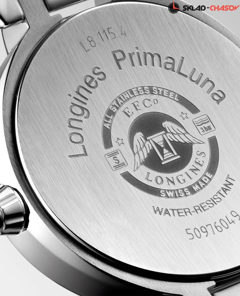 Женские швейцарские часы Longines PrimaLuna L81154916, кварцевый механизм с высокой точностью. Исключительно женственная коллекция. Округлые, нежные линии Longines Prima Luna - дань преклонения перед женственной Луной, символом переменчивости времени. Сапфировое стекло устойчивое к появлению царапин, обладающее высокой прозрачностью. Корпус часов изготовлен из нержавеющей стали. Окошко даты в положении 3 часов. Указатель фазы луны в положении 6 часов. Класс водозащиты: 30 метров, позволит защитить корпус от случайных брызг или капель дождя. Стальной браслет на застёжке «бабочка» с кнопками.