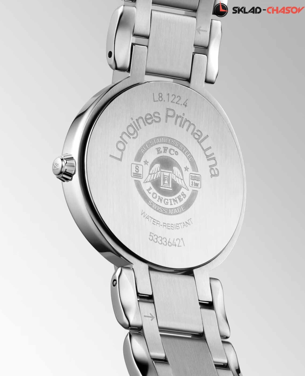 Женские швейцарские часы Longines PrimaLuna L8.122.4.71.6, кварцевый механизм с высокой точностью. Исключительно женственная коллекция. Сапфировое стекло устойчивое к появлению царапин, обладающее высокой прозрачностью. Корпус часов изготовлен из нержавеющей стали. Окошко даты в положении 3 часов. Класс водозащиты: 30 метров, позволит защитить корпус от случайных брызг или капель дождя. Стальной браслет на застёжке «бабочка» с кнопками.
