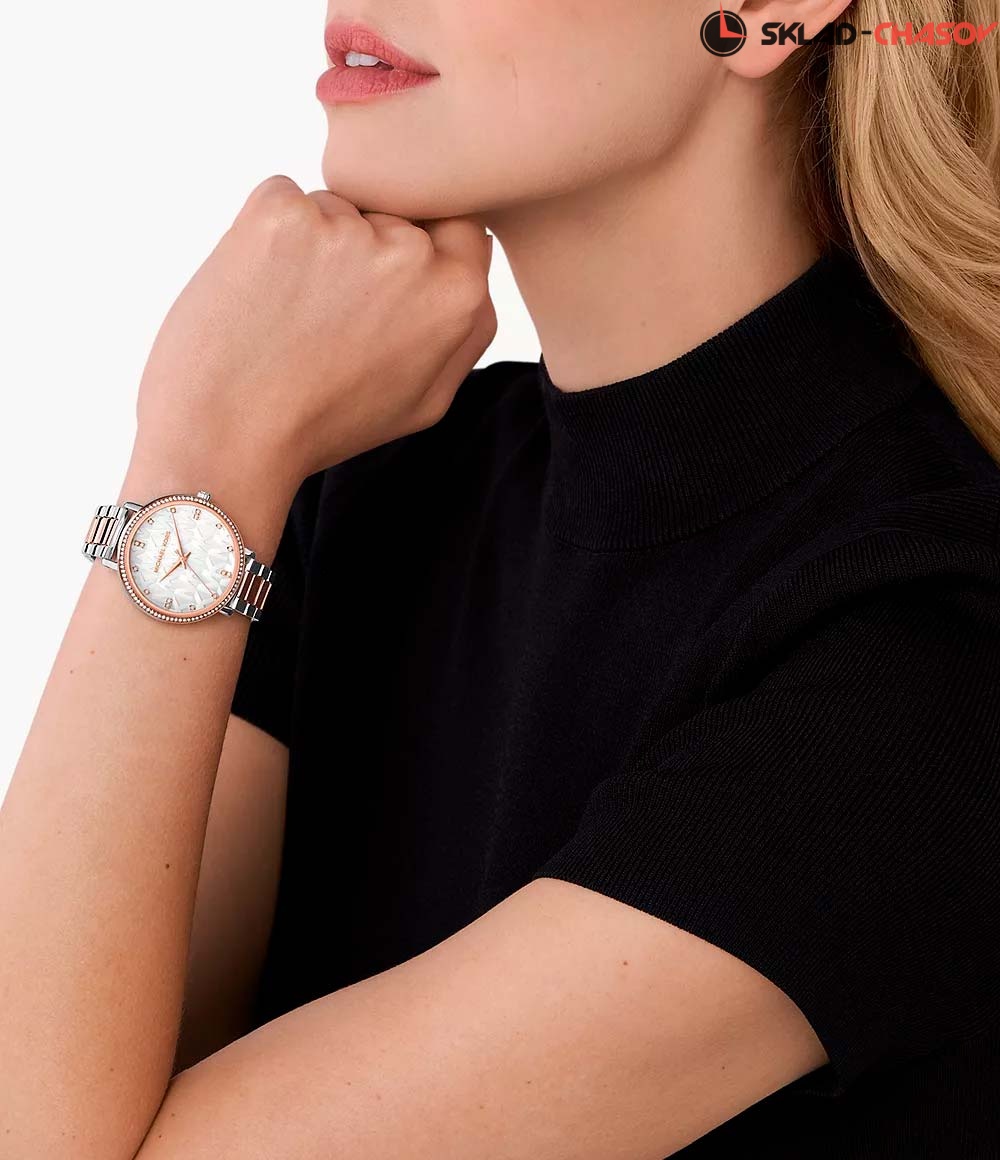 Такой аксессуар подчеркнет элегантный стиль своей обладательницы и ее стремление к безупречности. Женские часы с круглым стальным корпусом. Циферблат украшен принтом с логотипом бренда. Метки в виде штрихов и точек. Рифленая заводная головка. Браслет с раскладывающейся застежкой.