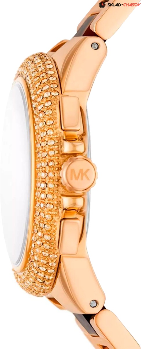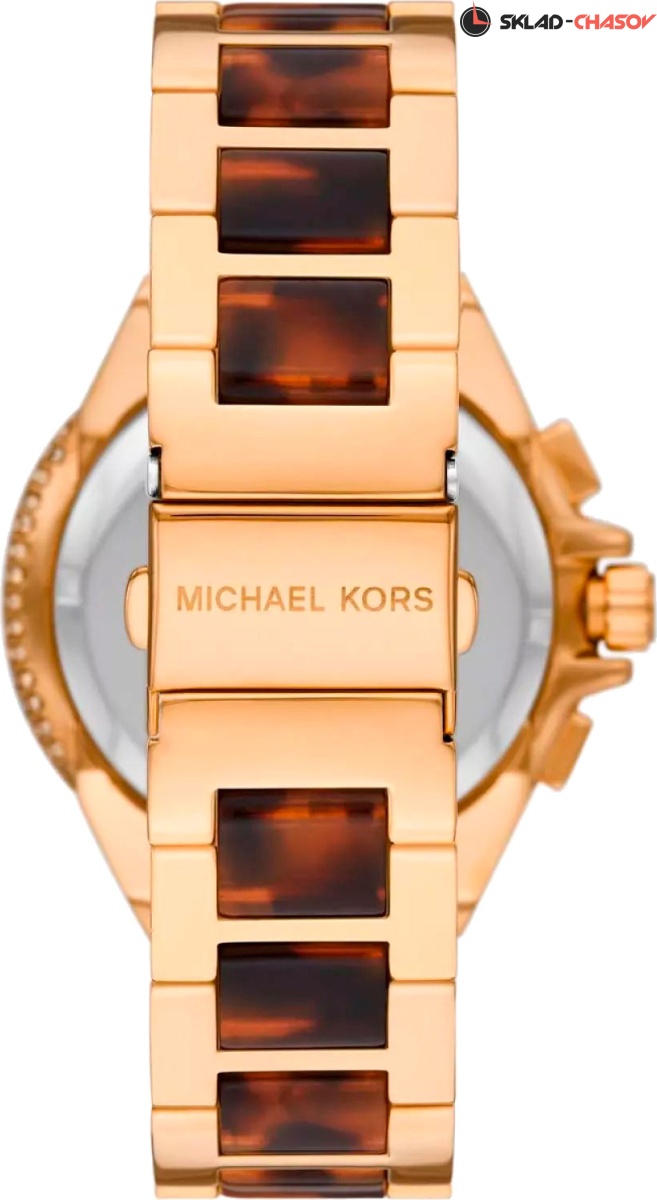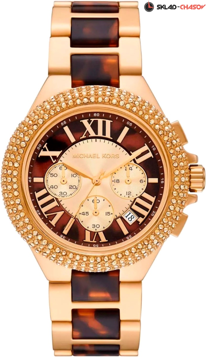 Завораживающий блеск этих часов наверняка привлечет к вам внимание и сделает ваш образ незабываемым. Женские кварцевые часы-хронограф с секундомером. Круглый стальной корпус с PVD покрытием цвета желтого золота. Безель декорирован кристальным паве. Циферблат с метками в виде римских цифр и штрихов защищен минеральным стеклом. По краю циферблата нанесена минутная шкала. Окошко даты находится в положении между отметками 4 и 5 часов. 12-ти и 24-х часовой формат времени. Рифленая заводная головка с защитой. Стальной браслет с PVD покрытием цвета желтого золота и вставками из ацетата черепаховой расцветки.