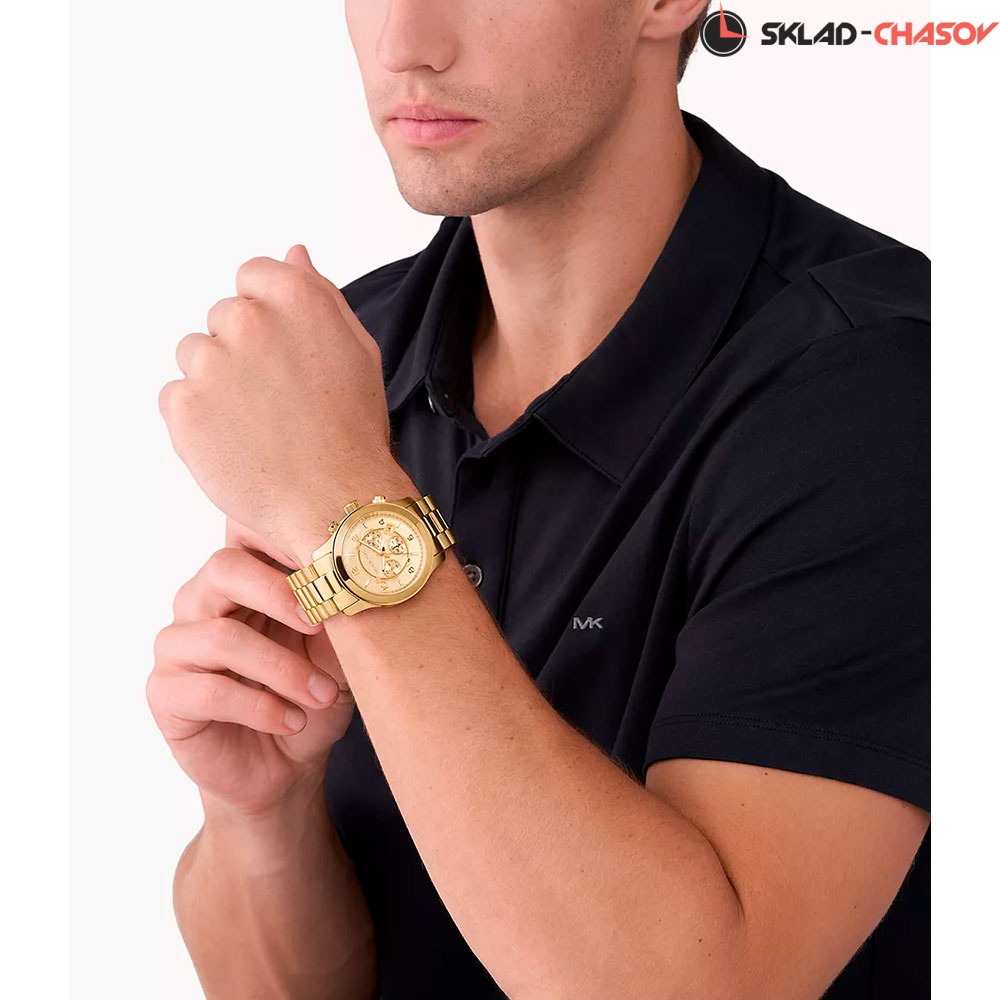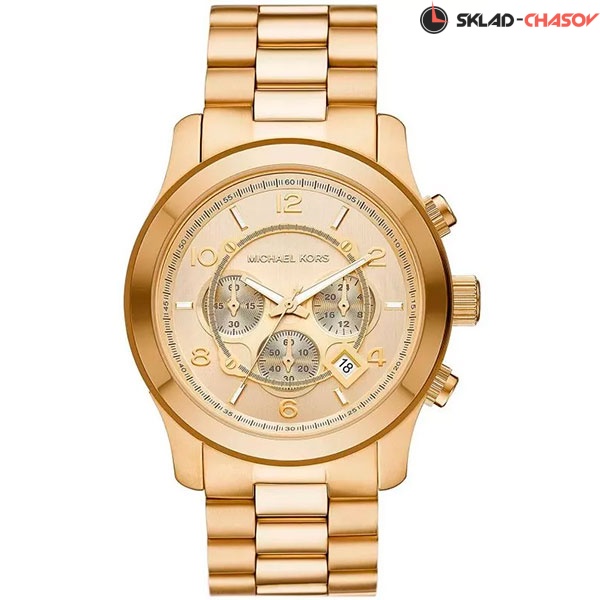 Кварцевый хронограф. Центральные часовая и минутная стрелки, секундная стрелка вынесена на малый циферблат. Апертура даты между 4 и 5 часами. 12/24х часовой формат времени. Секундомер. Золотистый циферблат. Круглый корпус выполнен из нержавеющей стали с PVD покрытием цвета желтого золота. Диаметр корпуса составляет 45 мм. Стальной браслет с покрытием шириной 24 мм, раскладывающаяся застежка. Прочное минеральное стекло устойчивое к мелким механическим повреждениям. Водостойкость WR 100 (плавание без погружения).