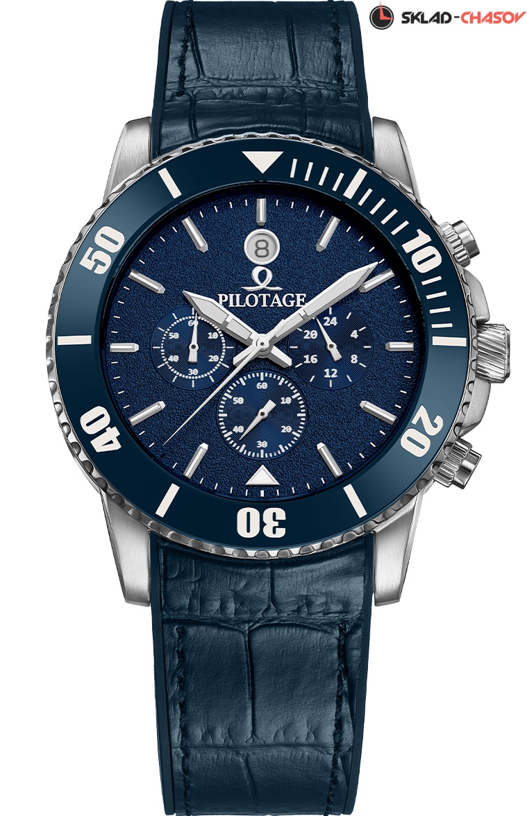 Необычная текстура синего циферблата напоминает шероховатость взлетной полосы. Дополнительные индикаторы — счетчик минут, вынесенная секундная стрелка и индикатор 24-х часов - визуально выделены с помощью полировки. Отдельное окошко предусмотрено для демонстрации текущей даты. Центральные стрелки часов и минут, а также накладные индексы покрыты специальным люминесцентным составом, который светится в темноте. Над циферблатом установлено сапфировое стекло. Заводная головка и задняя крышка завинчиваются, что волне ожидаемо для модели с повышенной водостойкостью 20 атмосфер.
