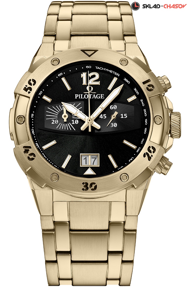 Стальной корпус с PVD-покрытием из желтого золота состоит из нескольких частей, в том числе из задней крышки на винтах и накладной пластине с дополнительной индикацией на безеле. Задняя крышка, закрепленная на 4-х винтах, и ушки модели слегка выгнуты — так часы удобнее лежат на запястье. Гравировка в виде спиралевидных линий на заводной головке и кнопках хронографа напоминает лопасти самолетной турбины и делает их более удобными в использовании.