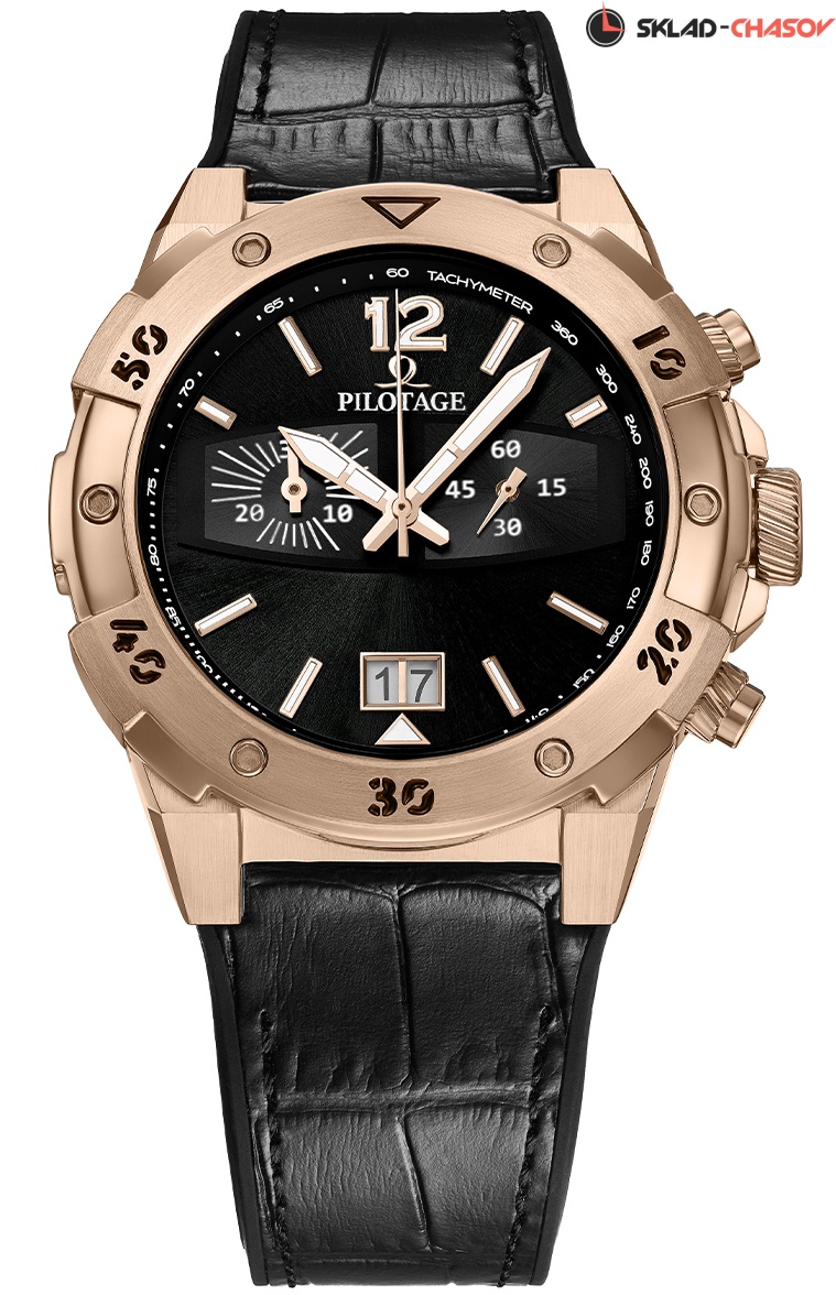 Стальной корпус с PVD-покрытием из розового золота состоит из нескольких частей, в том числе из задней крышки на винтах и накладной пластине с дополнительной индикацией на безеле. Задняя крышка, закрепленная на 4-х винтах, и ушки модели слегка выгнуты — так часы удобнее лежат на запястье. Гравировка в виде спиралевидных линий на заводной головке и кнопках хронографа напоминает лопасти самолетной турбины и делает их более удобными в использовании.