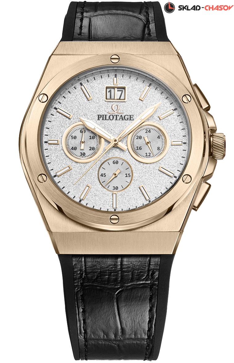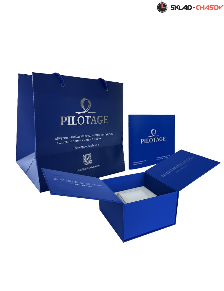 Кварцевый механизм TMI оснащен функциями минутного и секундного накопителя, индикатором времени в 24-часовом формате, вынесенной секундной стрелкой и большой датой. Все дополнительные индикаторы хорошо читаются на белом циферблате модели. Центральные стрелки и накладные риски покрыты светящимся в темноте люминесцентным составом. Необычная текстура циферблата напоминает шероховатость взлетной полосы — создатели хронографа Pilotage вдохновлялись полетами и всем, что с ними связано. Так, логотип бренда, в котором без труда можно узнать рисунок фигуры высшего пилотажа под названием «мертвая петля», украшает циферблат модели в виде полированного накладного элемента, заводную головку, застежку и заднюю крышку в виде гравировки. На завинчивающейся задней крышке, помимо логотипа, вы увидите изображение летящего в облаках самолета, надпись под которым - “Let’s fly!” - можно перевести как некий призыв: «Полетели!». Он отражает восхищение создателей бренда летчиками - покорителями небесной высоты. Рельеф на заводной головке напоминает по форме лопасти самолетной турбины. В часах установлено сапфировое стекло, структура которого позволяет ему противостоять появлению микроцарапин. Водостойкость равна 10 атмосфер. Ремешок в часах необычный, он состоит из двух слоев, первый из которых сделан из натуральной кожи, а второй, внутренний, из силикона. Ремешок, таким образом, не боится повышенной влажности, благодаря свойствам силикона и нанесенному на него рельефу. Застежка-клипса оснащена двумя боковыми кнопками и дополнительной защитой от случайного расстегивания. Часы Turbine Chrono - эффектный аксессуар, собранный из материалов высокого качества. Он будет радовать своего владельца долгие годы, сохраняя внешний вид и функциональность. Хронограф хорошо дополняет как деловой образ, так и вещи в более расслабленном, повседневном стиле.