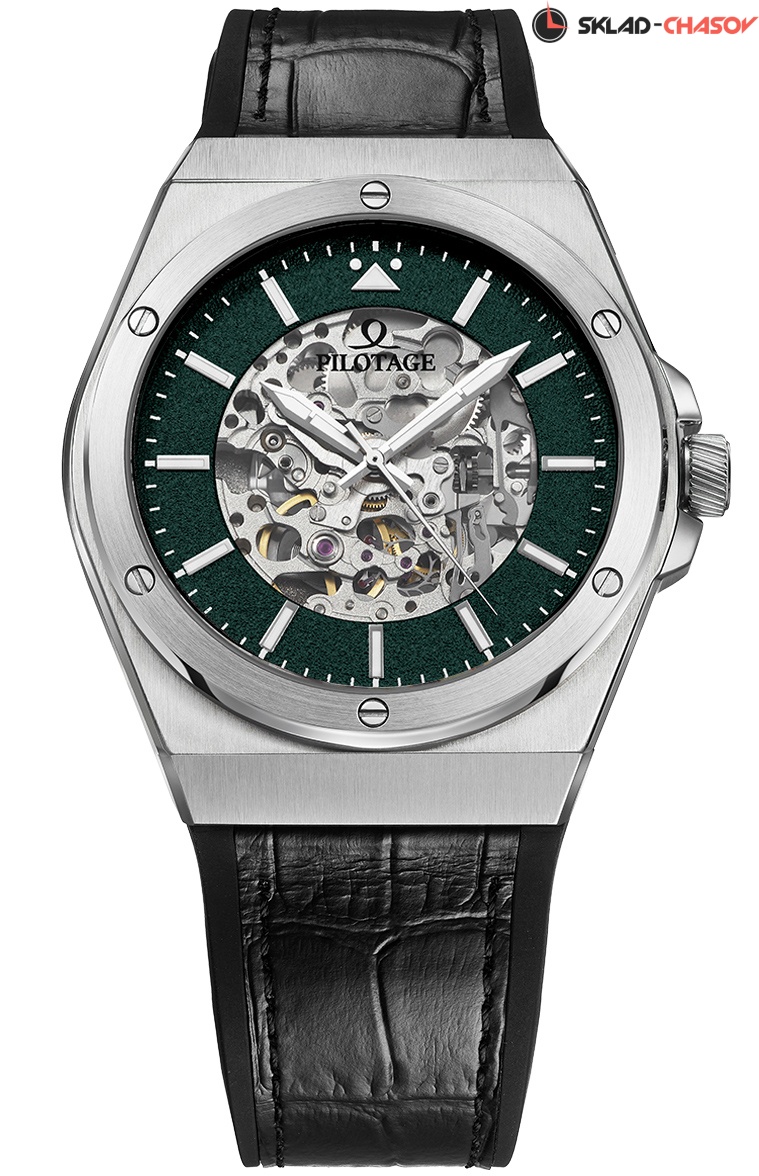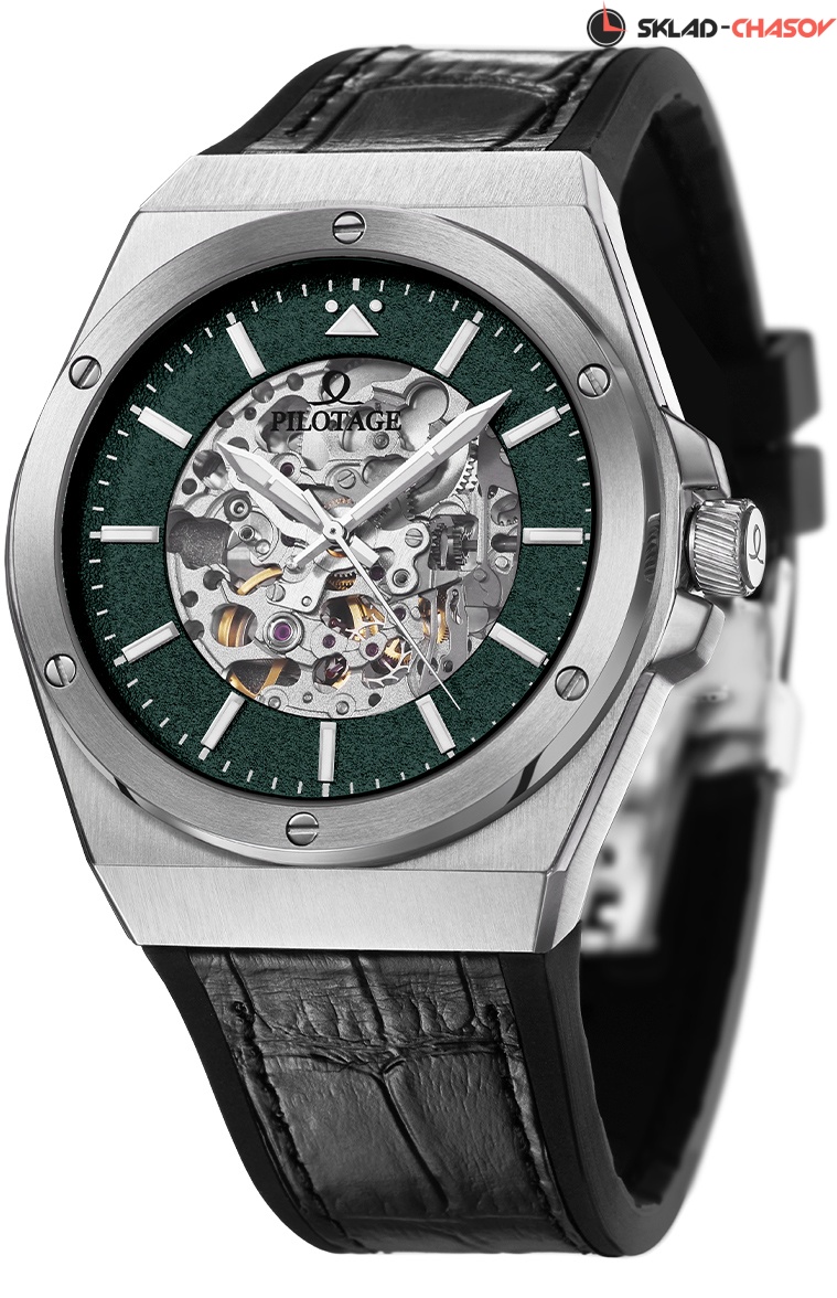 Их владелец может наблюдать за работой практически каждой детали механизма Miyota с функцией автоподзавода. Массивный корпус из нержавеющей стали обладает интересной деталью: его ушки слегка выгнуты, что позволяет часам удобно лежать на запястье. Безель крепится к корпусу с помощью 6-ти декоративный винтов. Центральные стрелки и накладные риски покрыты светящимся в темноте люминесцентным составом. Риски закреплены на пластине с необычной текстурой, напоминающей шероховатость взлетной полосы - создатели часов Turbine Auto вдохновлялись полетами и всем, что с ними связано. Так, логотип бренда, в котором без труда можно узнать схематическое изображение фигуры высшего пилотажа под названием «мертвая петля», украшает циферблат модели и ротор, а также, заводную головку и застежку - уже в виде гравировки. На роторе, помимо логотипа, вы увидите надпись - “Let’s fly!” - ее можно перевести как некий призыв: «Полетели!». Он отражает восхищение создателей бренда летчиками - покорителями небесной высоты. Рельеф на заводной головке напоминает по форме лопасти самолетной турбины. В часах установлено сапфировое стекло, структура которого позволяет ему противостоять появлению микроцарапин. Водостойкость равна 10 атмосфер. Ремешок в часах необычный, он состоит из двух слоев, первый из которых сделан из натуральной кожи, а второй, внутренний, из силикона. Ремешок, таким образом, не боится повышенной влажности, благодаря свойствам силикона и нанесенному на него рельефу. Застежка-клипса оснащена двумя боковыми кнопками и дополнительной защитой от случайного расстегивания. Часы Turbine Auto - эффектный аксессуар, собранный из материалов высокого качества. Он будет радовать своего владельца долгие годы, сохраняя внешний вид и функциональность. Часы хорошо дополнят как деловой образ, так и вещи в более расслабленном, повседневном стиле.