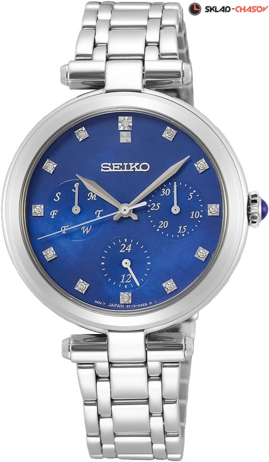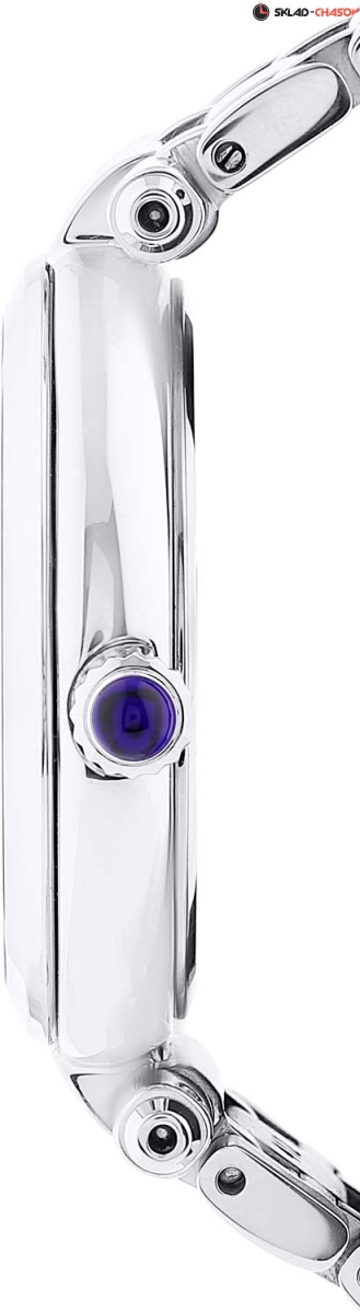 Этот яркий аксессуар станет настоящей находкой для любительницы роскошных образов. Женские наручные часы. Круглый стальной корпус. 12-ти и 24-х часовой формат времени. Перламутровый циферблат с метками в виде точек, инкрустированных кристаллами. Время в 24-х часовом формате, число и день недели отображаются на отдельных циферблатах. Рифленая заводная головка украшена синим камнем в форме кабошона. Браслет с тройной раскладывающейся застежкой.