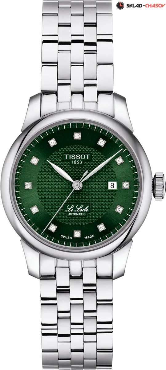 Женские наручные часы Le Locle Automatic. В механизме 24 камня. Запас хода 48 часов. Круглый стальной корпус. Циферблат с метками в виде точек, украшенных бриллиантами. Листовидные стрелки в стиле Feuille. Окошко даты находится в положении 3 часа. Рифленая заводная головка. Прозрачная задняя крышка. Стальной браслет с раскладывающейся застежкой.