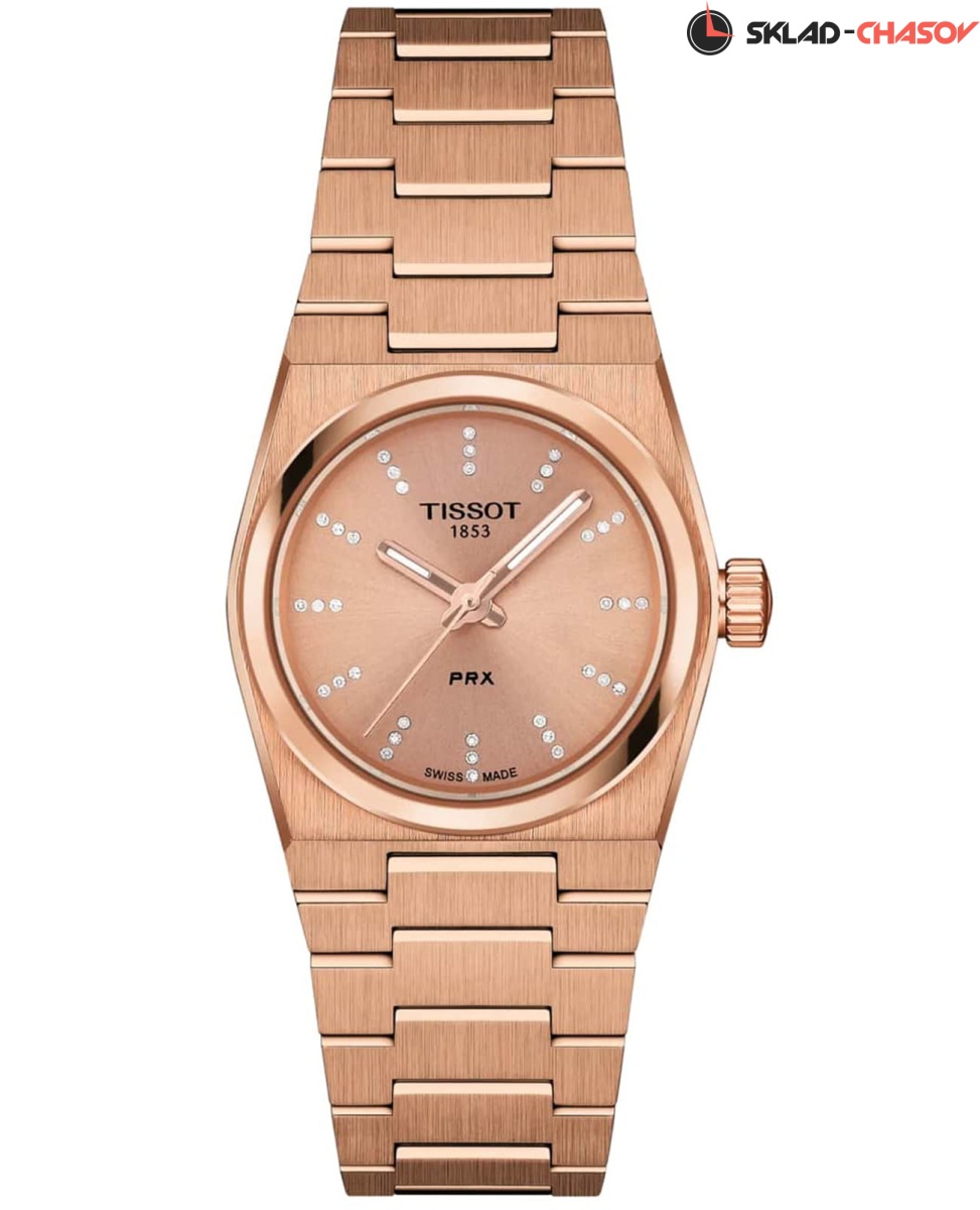 Часы Tissot PRX 25 мм T137.010.33.506.00 сочетают винтажный стиль 70-х годов с современными технологиями. Корпус диаметром 25 мм выполнен из нержавеющей стали 316L с покрытием PVD цвета розового золота, придающим часам элегантный вид. Розовый циферблат украшен 36 бриллиантами общим весом 0,4 карата, что добавляет изысканности. Циферблат защищён сапфировым стеклом с антибликовым покрытием, обеспечивающим стойкость к царапинам и отличную читаемость.