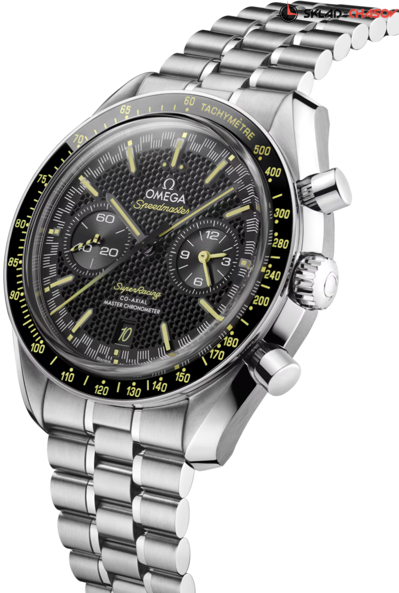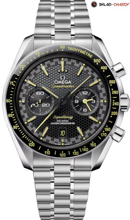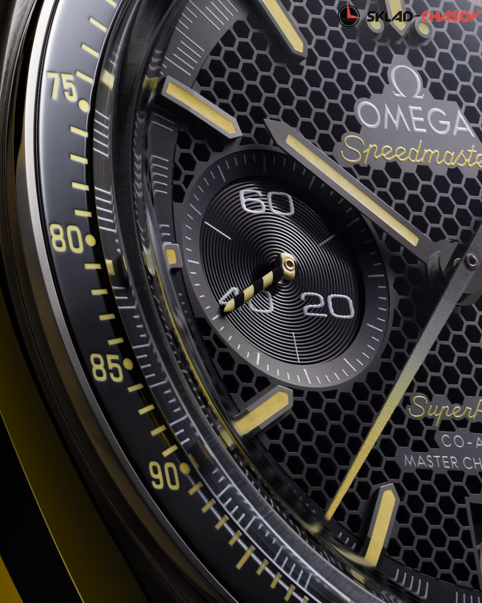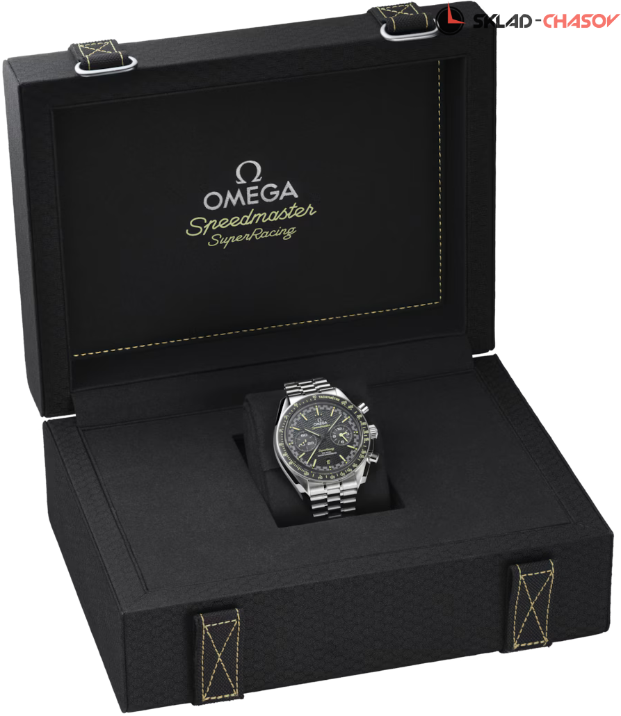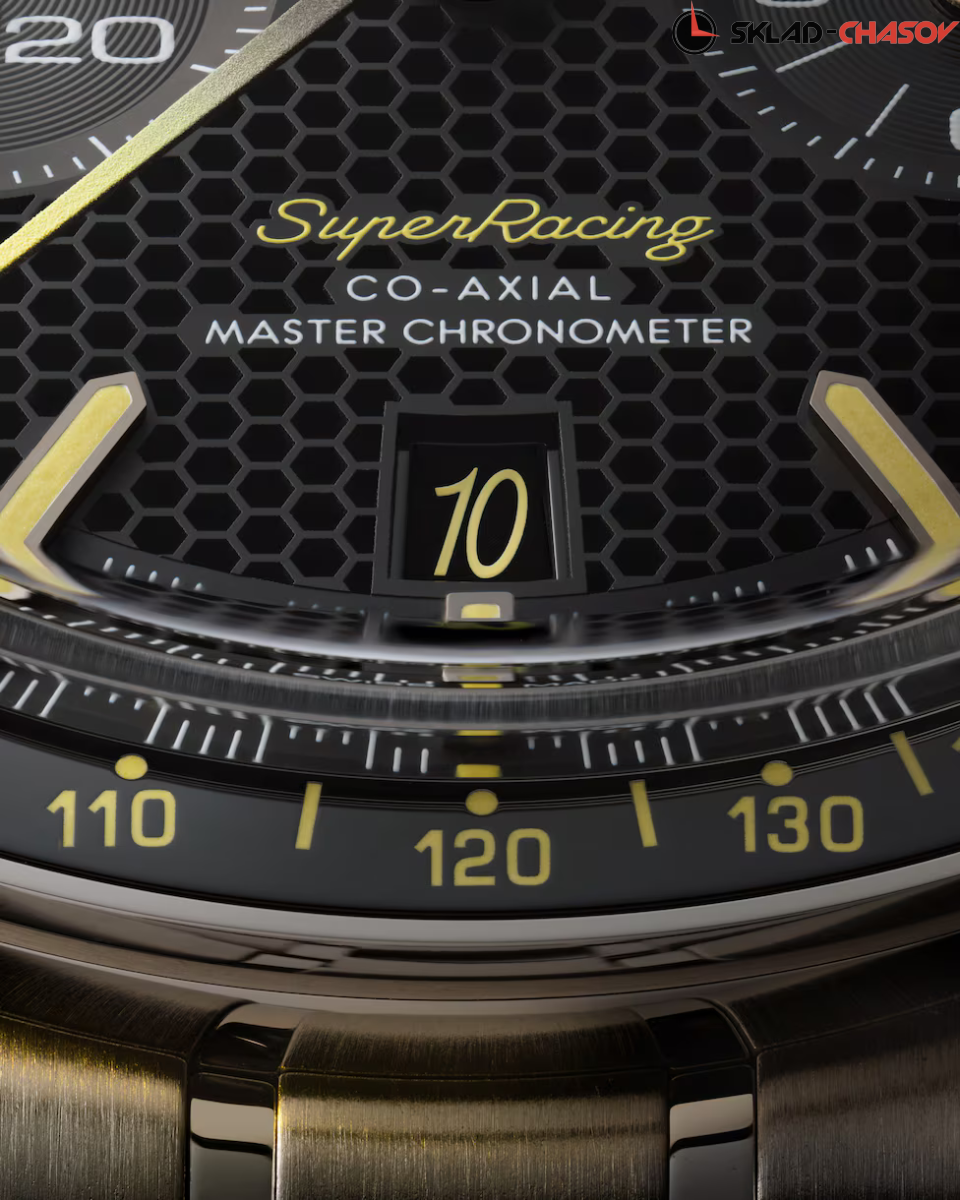Модель OMEGA Speedmaster диаметром 44,25 мм из нержавеющей стали – часы 2023 года, впервые оснащенные системой Spirate™. Они отличаются черным многослойным циферблатом с узором в виде сот, на который нанесена минутная шкала в гоночном стиле, давшая название часам. Циферблат обрамляет черный керамический ободок с тахиметрической шкалой из эмали желтого цвета, выполненной в технике Grand Feu. Для стрелки хронографа также использован этот оттенок с градиентным переходом. При этом малая секундная стрелка в положении «9 часов» оформлена в желто-черную полоску. В положении «3 часа» размещен 60-минутный и 12-часовой счетчик, а в положении «6 часов» – индикатор даты, в котором цифра «10» появляется в шрифте логотипа Speedmaster, как дань уважения юбилею модели Seamaster Aqua Terra >15'000 GAUSS. Полированные черные индексы в форме стрел со скошенными краями заполнены люминесцентным составом Super-LumiNova, излучающим свечение желтого цвета. Этот же цветовой код применен на надписях Speedmaster и Super Racing, расположенных на циферблате. Часы оснащены калибром OMEGA Co-Axial Master Chronometer 9920, сертифицированным Швейцарским федеральным институтом метрологии (METAS) в соответствии с самыми строгими стандартами в часовой индустрии. Первый в мире механизм, оснащенный запатентованной компанией OMEGA системой Spirate™. Модель поставляется в футляре для часов Speedmaster, оформленном в черном цвете с желтой строчкой и узором в виде сот. К нему прилагается ремешок NATO из переработанного нейлона с черными и желтыми полосами.