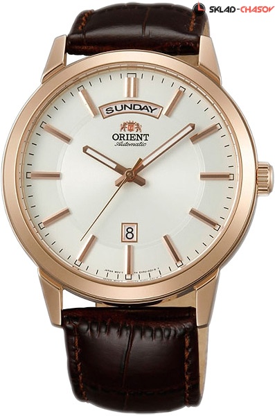 Мужские механические наручные часы с автоподзаводом Orient EV0U002W (FEV0U002WH) коллекции Wide Calendar. Калибр механизма — EV(46E). Запас хода более 40-ка часов. Количество камней - 21. Максимально допустимая погрешность точности хода +25/-15 секунд в сутки. На данной модели день недели отображается в полноформатном исполнении, а так же отображается дата. Стрелки и метки покрыты люминесцентным напылением (светятся в темноте). На корпус нанесено стойкое PVD покрытие. Завинчивающаяся задняя крышка часов. Водонепроницаемость WR50 (5 атм).