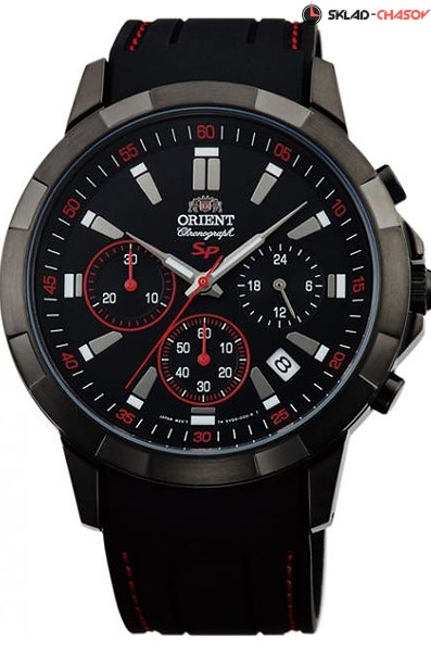 Мужские кварцевые наручные часы с хронографом (секундомером) Orient KV00005B (FKV00005B0) коллекции Orient Sport. Калибр механизма — KV. Максимально допустимая погрешность точности хода +20/-20 секунд в месяц. На данной модели отображается дата и время суток (24-х часовая шкала). Секундомер может отсчитывать до 30-ти минут. Стрелки и метки покрыты люминесцентным напылением (светятся в темноте). На корпус нанесено PVD покрытие. Завинчивающаяся задняя крышка. Водонепроницаемость WR50 (5 атм).