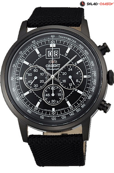 Мужские кварцевые наручные часы с хронографом (секундомером) Orient TV02001B (FTV02001B0). Калибр механизма — TV(KFC). Максимально допустимая погрешность точности хода +20/-20 секунд в месяц. Секундомер может отсчитывать до 60-ти минут, так же на циферблате часов присутствует шкала тахиметра для измерения средней скорости движения. На данной модели отображается дата и индикация времени суток (24-х часовая шкала). Стрелки и метки покрыты люминесцентным напылением (светятся в темноте). На корпус нанесено стойкое PVD покрытие. Текстильный ремешок. Завинчивающаяся задняя крышка для более уверенной водонепроницаемости часов. Водонепроницаемость WR50 (5 атм).