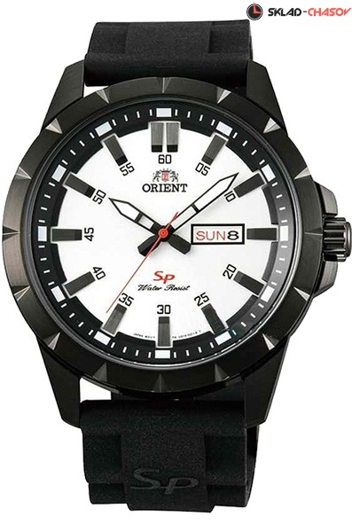 Мужские кварцевые наручные часы Orient UG1X006W (FUG1X006W9). Калибр механизма — UG(HS9). Максимально допустимая погрешность точности хода +20/-20 секунд в месяц. На данной модели отображается дата и день недели. Стрелки и метки покрыты люминесцентным напылением (светятся в темноте). На корпус нанесено PVD покрытие чёрного цвета. Завинчивающаяся задняя крышка. Водонепроницаемость WR50 (5 атм).