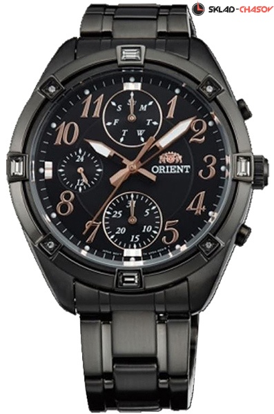 Женские кварцевые наручные часы Orient UY04001B (FUY04001B0). Калибр механизма — UY. Максимально допустимая погрешность точности хода +20/-20 секунд в месяц. На данной модели отображается дата, день недели и время суток (24-х часовая шкала). Стрелки и метки покрыты люминесцентным напылением (светятся в темноте). Корпус украшен камнями из циркона. На корпус и браслет нанесено стойкое PVD покрытие. Водонепроницаемость WR50 (5 атм).