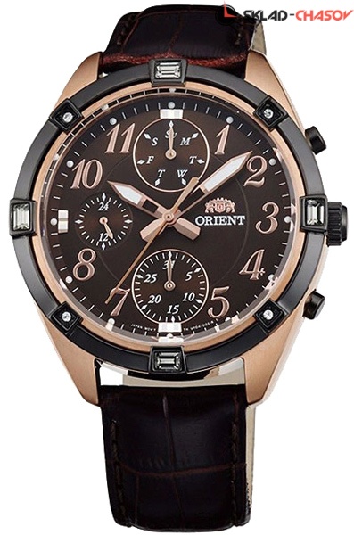 Женские кварцевые наручные часы Orient UY04004T (FUY04004T0). Калибр механизма — UY. Максимально допустимая погрешность точности хода +20/-20 секунд в месяц. На данной модели отображается дата, день недели и время суток (24-х часовая шкала). Стрелки и метки покрыты люминесцентным напылением (светятся в темноте). Корпус украшен камнями из циркона. На корпус нанесено стойкое PVD покрытие. Водонепроницаемость WR50 (5 атм).
