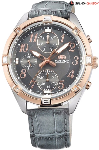Женские кварцевые наручные часы Orient UY04005A (FUY04005A0). Калибр механизма — UY. Максимально допустимая погрешность точности хода +20/-20 секунд в месяц. На данной модели отображается дата, день недели и время суток (24-х часовая шкала). Стрелки и метки покрыты люминесцентным напылением (светятся в темноте). Корпус украшен камнями из циркона. На корпус частично нанесено стойкое PVD покрытие. Водонепроницаемость WR50 (5 атм).