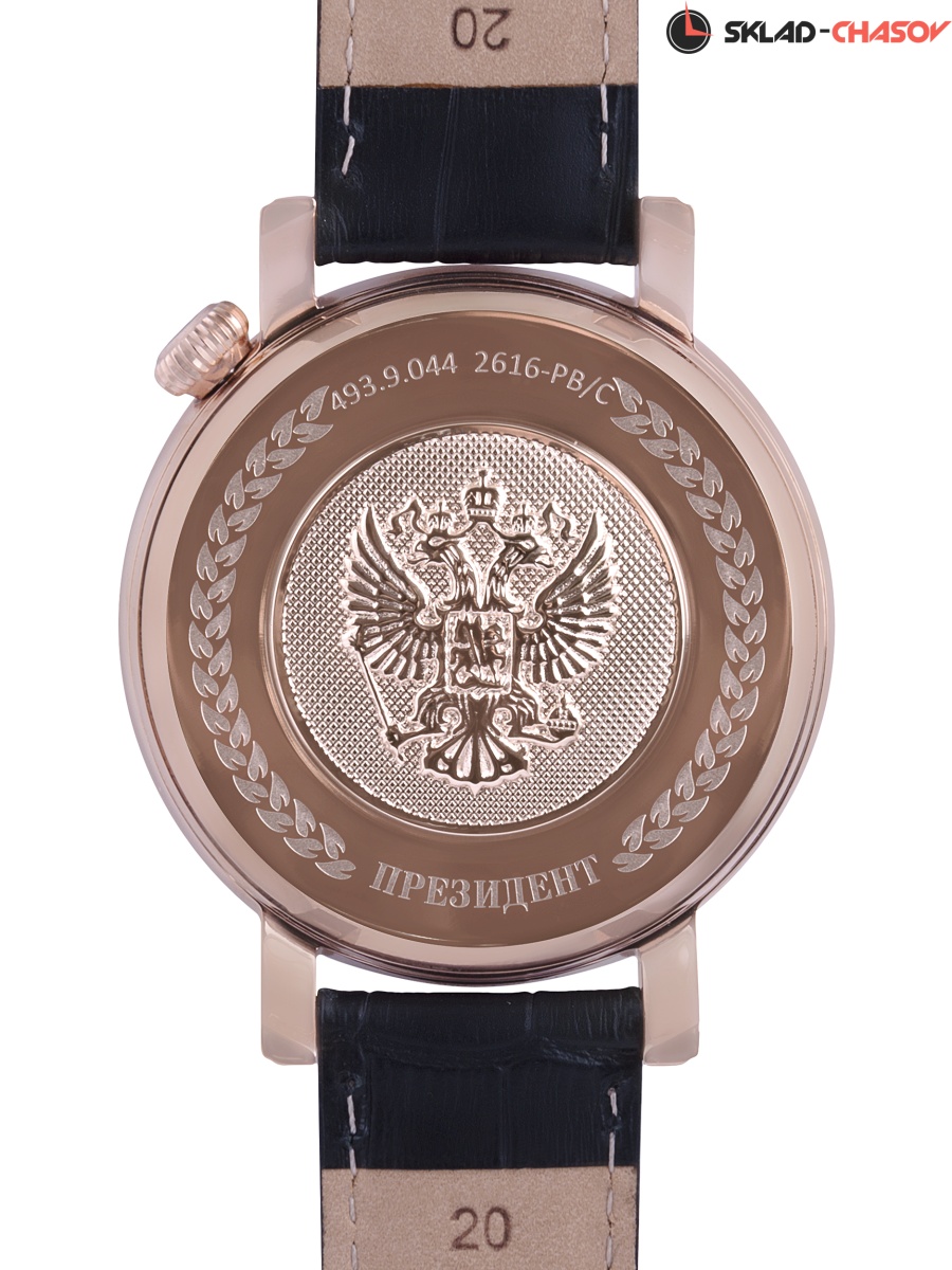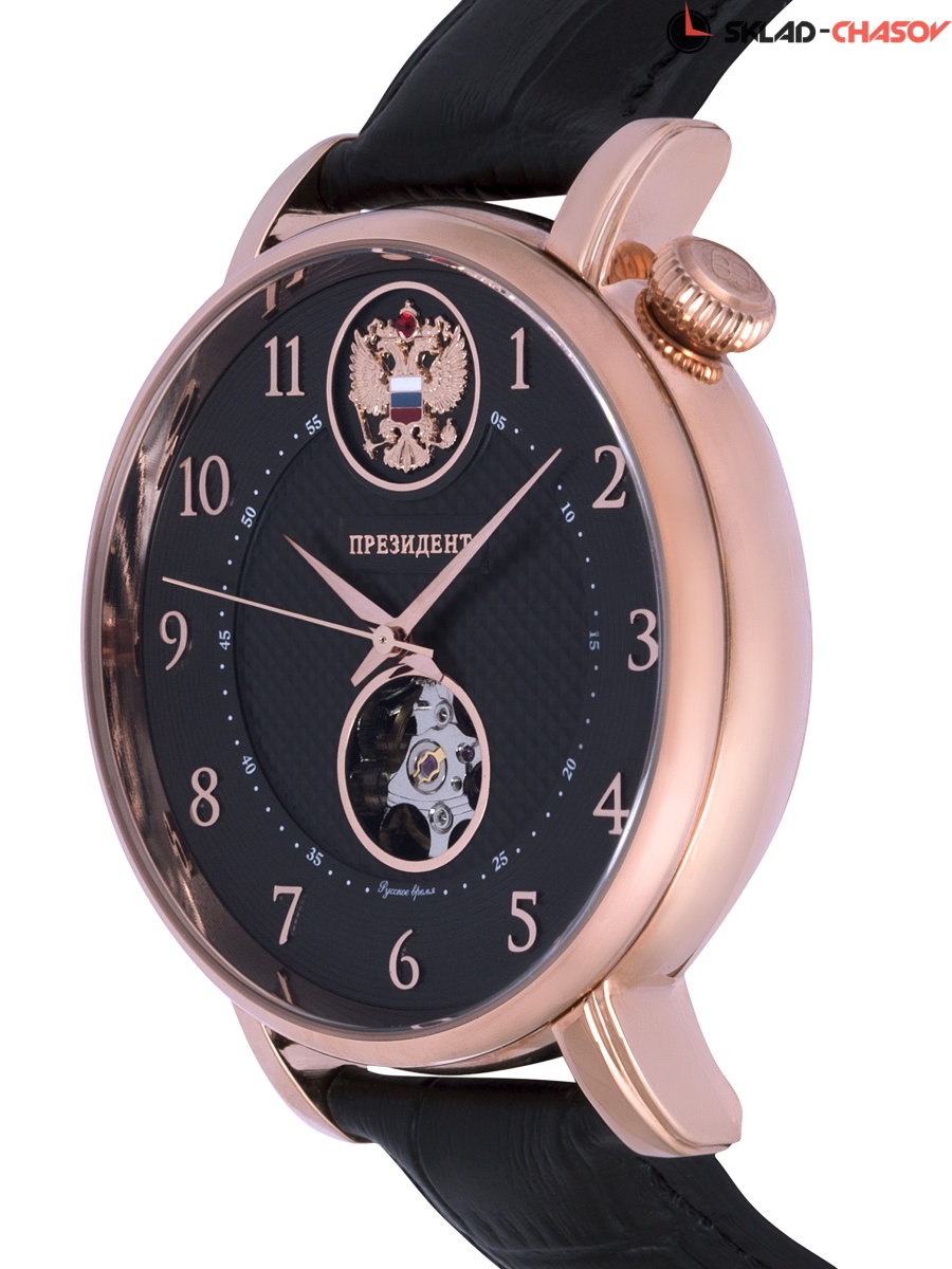 Механические мужские часы Президент с двуглавым орлом и соответствующей надписью выполнены в классическом стиле. На черном круглом циферблате выделяются арабские цифры, что позволит легко увидеть время. Для изготовления корпуса использовалась нержавеющая сталь, устойчивая к коррозии. Минеральное стекло отличается особой прочностью, прозрачностью. Не мутнеет с течением времени. Модель способна выдерживать давление воды до 3 АТМ, а значит спокойно переносить брызги капель, дождь. Механический механизм не требует подзавода.