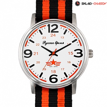 Часы с георгиевской лентой. К 70-летнему юбилею Победы в Великой Отечественной войне компания Часовой Дом «Полет» выпустила специальную модель наручных часов Русское время. Циферблат часов выполнен в цветовой гамме георгиевской ленточки. Стоит отметить, что новая модель оформлена модным нейлоновым ремешком. Ремешок выполнен также в цветовом варианте георгиевской ленты, в знак уважения к подвигу ветеранов Великой Отечественной войны. Одно из главных преимуществ нейлонового ремешка - достойное качество и прочность, комфортная посадка на запястье. Изготовленный из нейлонового материала ремень отличается повышенной износостойкостью и легкостью. Нейлоновые ремешки популярны во всем мире, они стали трендом и частью современного имиджа.